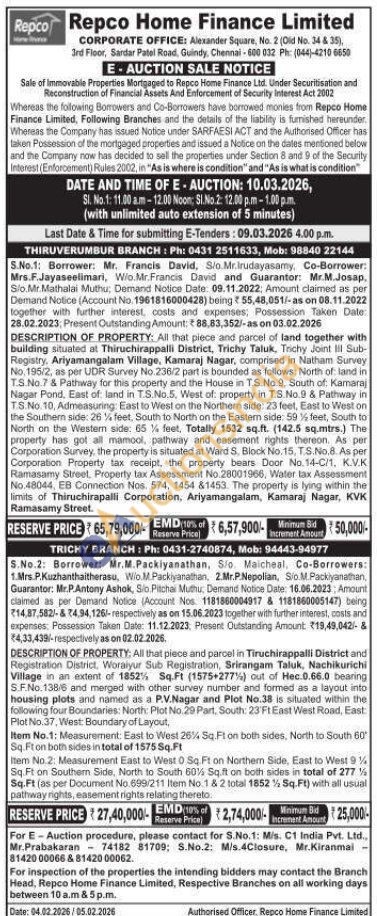 DESCRIPTION OF PROPERTY: All that piece and parcel of land together with building situated at Thiruchirappalli District, Trichy Taluk, Trichy Joint III Sub-Registry, Ariyamangalam Village, Kamaraj Nagar, comprised in Natham Survey No.195/2, as per UDR Survey No 236/2 part is bounded as follows: North of land in T.S No.7 & Pathway for this property and the House in TS No.9, South of Kamaraj Nagar Pond. East of land in T.S.No.5. West of: property in T.S.No.9 & Pathway in TS No. 10, Admeasuring: East to West on the Northern side: 23 feet, East to West on the Southern side: 2614 feet, South to North on the Eastem side: 59 15 feet, South to North on the Western side: 65% feet, Totally 1532 sq.ft. (142.5 sq.mtrs.) The property has got all mamool, pathway and easement rights thereon. As per Corporation Survey, the property is situated at Ward S. Block No.15, T.S.No.8. As per Corporation Property tax receipt, the property bears Door No.14-C/1, K.V.K Ramasamy Street. Property tax Assessment No.28001966, Water tax Assessment No.48044, EB Connection Nos. 574, 1454 &1453. The property is lying within the limits of Thiruchirapalli Corporation, Ariyamangalam, Kamaraj Nagar, KVK Ramasamy Street.