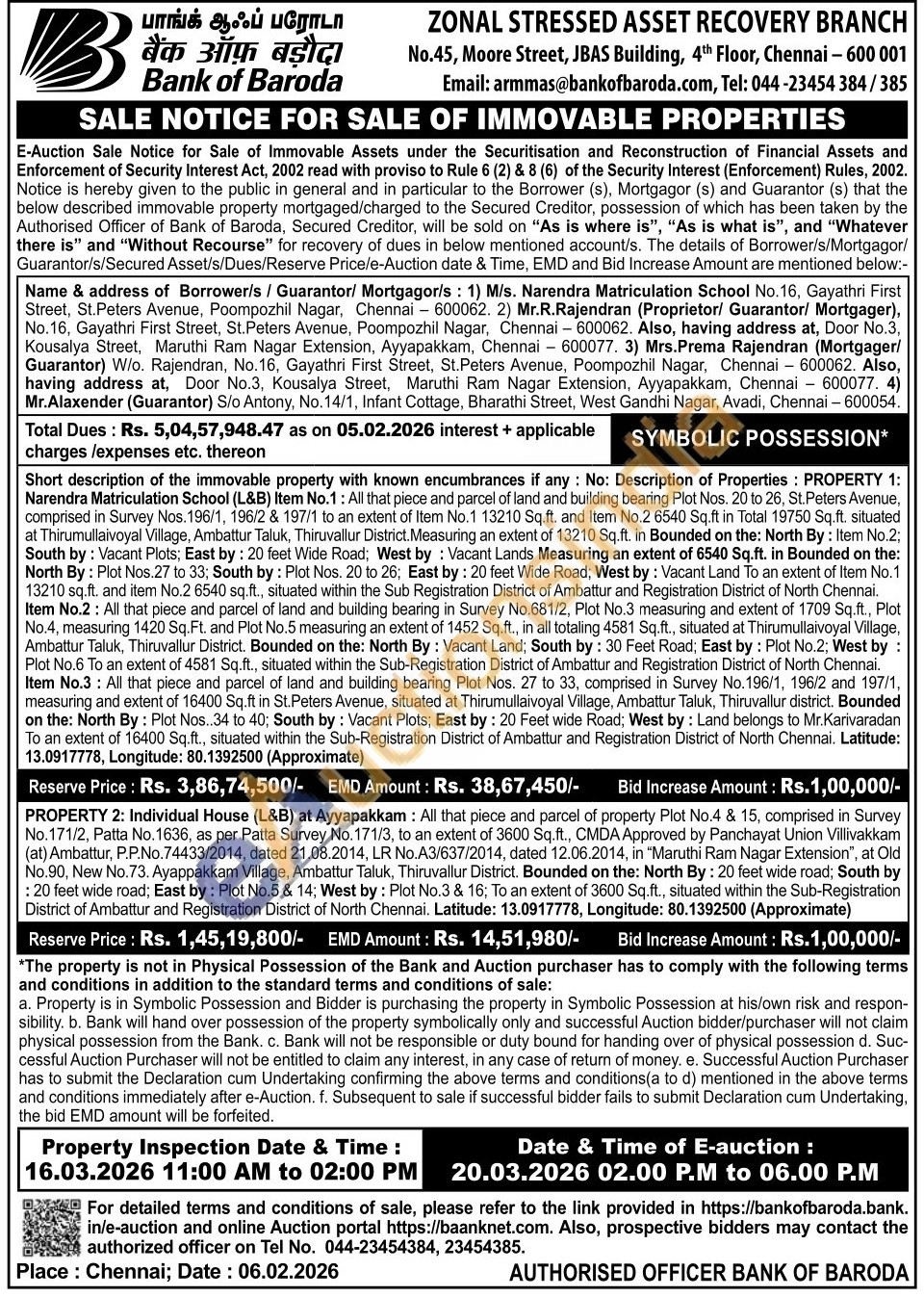 PROPERTY 2: Individual House (L&B) at Ayyapakkam: All that piece and parcel of property Plot No.4 & 15, comprised in Survey No.171/2, Patta No. 1636, as per Patta Survey No.171/3, to an extent of 3600 Sq.ft., CMDA Approved by Panchayat Union Villivakkam (at) Ambattur, P.P.No. 74433/2014, dated 21.08.2014, LR No.A3/637/2014, dated 12.06.2014, in "Maruthi Ram Nagar Extension", at Old No.90, New No.73. Ayappakkam Village, Ambattur Taluk, Thiruvallur District. Bounded on the: North By: 20 feet wide road; South by : 20 feet wide road; East by: Plot No.5 & 14; West by: Plot No.3 & 16; To an extent of 3600 Sq.ft., situated within the Sub-Registration District of Ambattur and Registration District of North Chennai. Latitude: 13.0917778, Longitude: 80.1392500 (Approximate)
