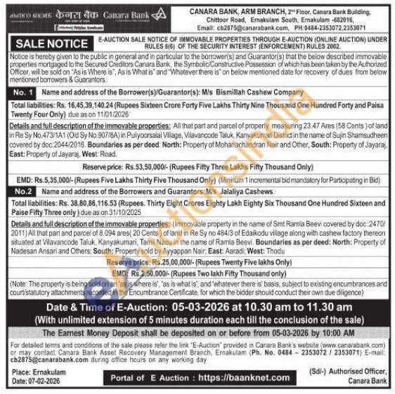 Details and full description of the immovable properties: All that part and parcel of property measuring 23.47 Ares 158 Cants) of land in Re Sy No.473/1A1 (Old Sy No.907/8A) in Puliyoorsalai Village, Vilavancode Taluk, Kanyakumari District in the name of Sujin Shamsudheen covered by doc 2044/2016. Boundaries as per deed North: Property of Mohanachandran Nair and Other, South: Property of Jayaraj. East: Property of Jayaraj, West: Road.