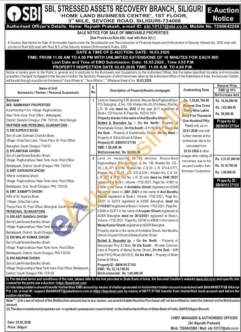 Land on measuring 58.745 decimal, Mouza-Bara Raghunathpur, P.S. Balurghat, JL No. 139, Khatian No. CS-35. LR. 371 & 5780, Khatian No. C.S 35, L.R. 374 & 5777, Khatian No. C.S.35. L.R. 370 & 5781, Khatian No. C.S. 35. L.R. 372 & 5779 Plot No. L.R. 25 vide deed no 2449/2021 registered at Book-l, Volume-1702-2021, Page No. 41887 to 41904 in the name of Amitabha Ghosh registered at ADSR Balurghat, deed no 2491 /2021 in the name of Asit Bandhu Ghosh registered at Book-1, Volume -1702-2021, Page No. 42001 to 42019 registered at ADSR Balurghat, deed no 3110/2021 registered at Book-I, Volume-1702-2021, Page No. 53360 to 53377 in the name of Anupam Ghosh registered at ADSR Balurghat deed no 2612/2021 registered at Book-l Volume-1702-2021, Page No. 45792 to 45808 in the name of Malay Kumar Ghosh registered at ADSR Balurghat. Property stands in the name of Amitabha Ghosh, Asit Bandhu Ghosh, Anupam Ghosh & Malay Kumar Ghosh Butted & Bounded by On the North: Property of Manaranjan Roy & Other, On the South: 9ft wide Common Lane & Property of Manoj Kumar Ghosh, On the East:-60ft wide P.W.D Road (NH-512), On the West:- Property of Milan Sarkar & Others Property ID: SBIN10137155 EMD: Rs. 33.18.700.00 Bid Incremental: Rs. 1,00,000.00