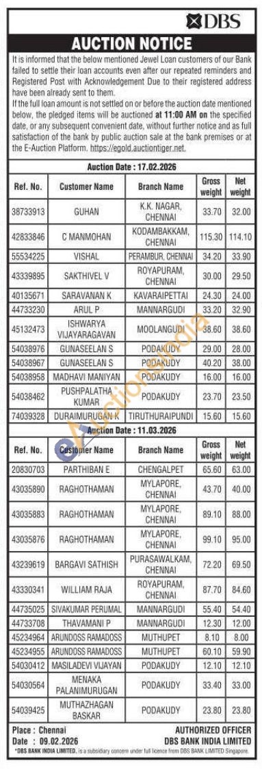 DBS Bank India Limited Gold Auctions Auction in Bengaluru