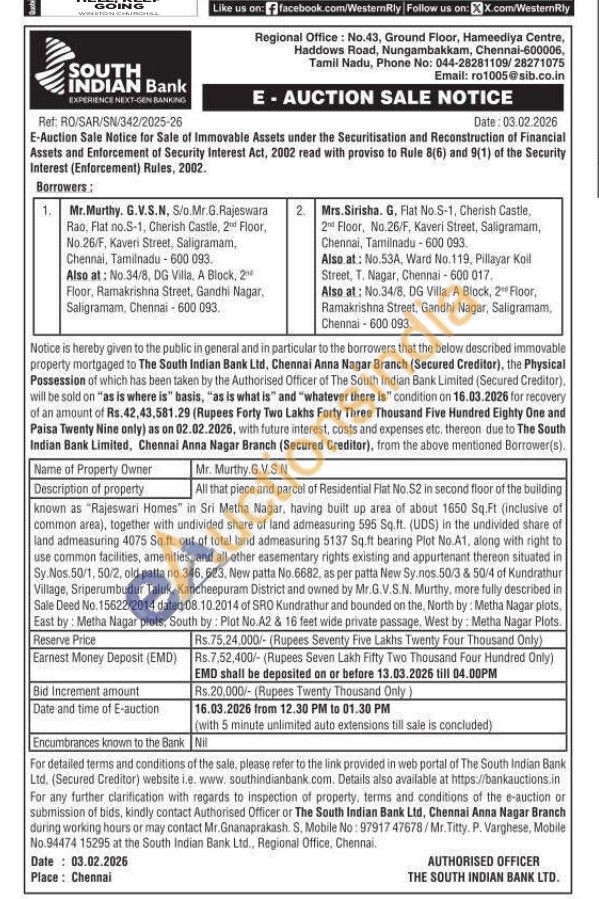 All that piece and parcel of Residential Flat No.S2 in second floor of the building known as "Rajeswari Homes" in Sri Metha Nagar, having built up area of about 1650 Sq.Ft (inclusive of common area), together with undivided share of land admeasuring 595 Sq.ft. (UDS) in the undivided share of land admeasuring 4075 Sq.ft. out of total land admeasuring 5137 Sq.ft bearing Plot No. A1, along with right to use common facilities, amenities, and all other easementary rights existing and appurtenant thereon situated in Sy Nos. 50/1, 50/2, old patta no.346, 623. New patta No.6682, as per patta New Sy.nos 50/3 & 50/4 of Kundrathur Village, Sriperumbudur Taluk, Kancheepuram District and owned by Mr.G.V.S.N. Murthy, more fully described in Sale Deed No. 15622/2014 dated 08.10.2014 of SRO Kundrathur and bounded on the, North by: Metha Nagar plots, East by: Metha Nagar plots, South by: Plot No.A2 & 16 feet wide private passage. West by: Metha Nagar Plots