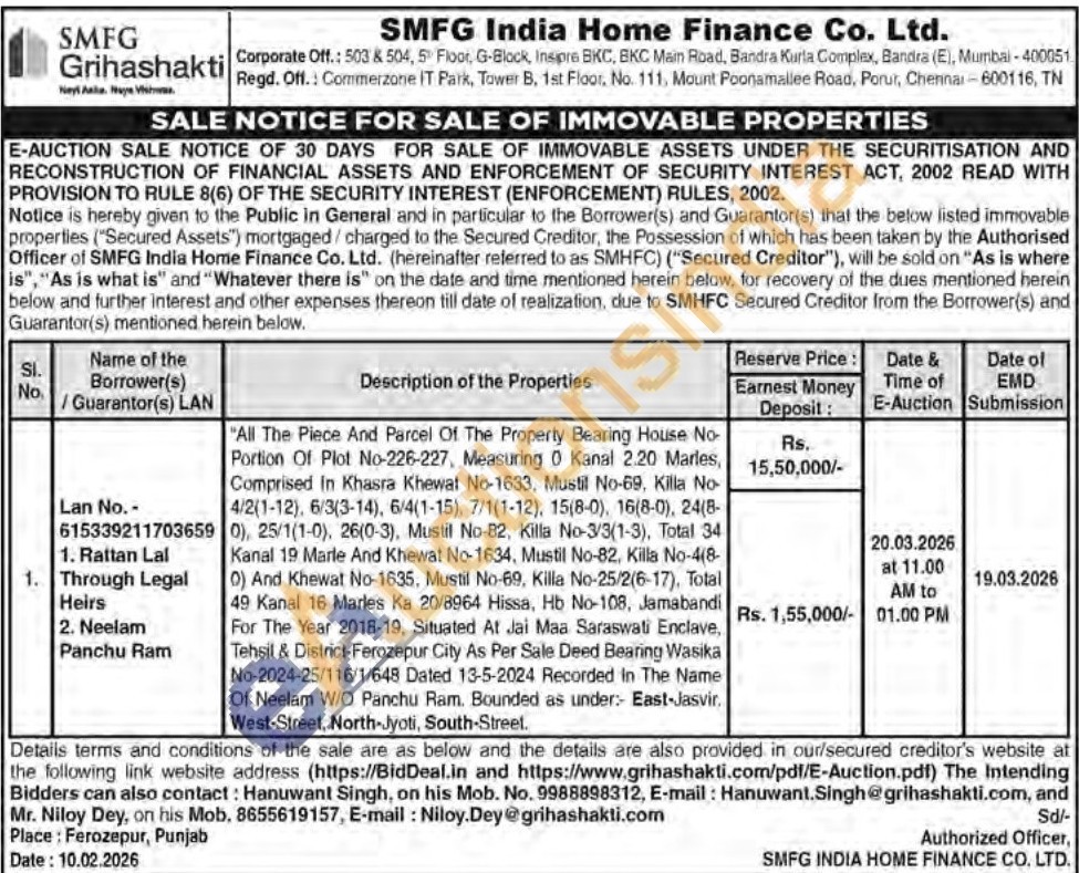 "All The Piece And Parcel Of The Property Bearing House No-Portion Of Plot No-226-227, Measuring 0 Kanal 2.20 Marles, Comprised In Khasra Khewat No-1633, Mustil No-69, Killa No-4/2(1-12), 6/3(3-14), 6/4(1-15), 7/1(1-12), 15(8-0), 16(8-0), 24(8-0), 25/1(1-0), 26(0-3), Mustil No-82, Killa No-3/3(1-3), Total 34 Kanal 19 Marle And Khewat No-1634, Mustil No-82, Killa No-4(8-0) And Khewat No-1635, Mustil No-69, Killa No-25/2(6-17), Total 49 Kanal 16 Marles Ka 20/8964 Hissa, Hb No-108, Jamabandi For The Year 2018-19, Situated At Jai Maa Saraswati Enclave, Tehsil & District-Ferozepur City As Per Sale Deed Bearing Wasika No-2024-25/116/1/648 Dated 13-5-2024 Recorded In The Name Of Neelam W/O Panchu Ram. Bounded as under:- East-Jasvir. West-Street, North-Jyoti, South-Street.