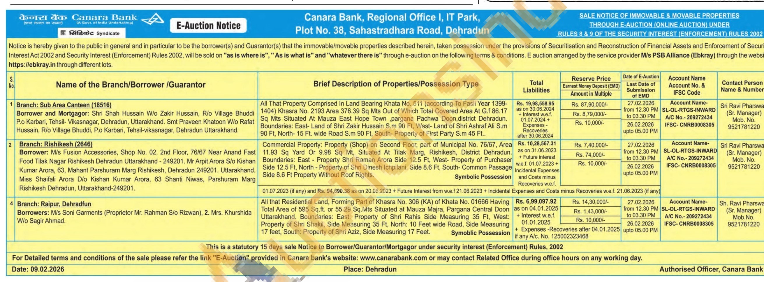 Commercial Property: Property (Shop) on Second Floor, part of Municipal No. 76/67, Area 11.93 Sq Yard Or 9.98 Sq Mt. Situated At Tilak Marg, Rishikesh, District Dehradun, Boundaries: East - Property Shri Raman Arora Side 12.5 Ft, West- Property of Purchaser Side 12.5 Ft. North-Property of Shri Dinesh Ichpilani, Side 8.6 Ft, South-Common Passage Side 8.6 Ft Property Without Roof Rights.