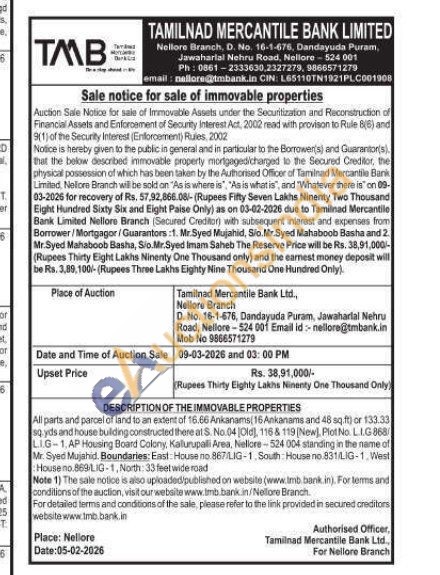 All parts and parcel of land to an extent of 16.66 Anikanams: 16 Ankanams and 48 sq.ft or 133.33 sq. yds and house building constructed there at S. No.04 [Old), 1168 119 (New), Plot No. L.I.G 868 L.1.G-1, AP Housing Board Colony, Kalurupali Area, Nellore-524 004 standing in the name of Mr. Syed Mujahid. Boundaries: East House no 867/LIG-1 South House no 831/LIG-1, West House no.869/LIG-1, North: 33 feet wide road
