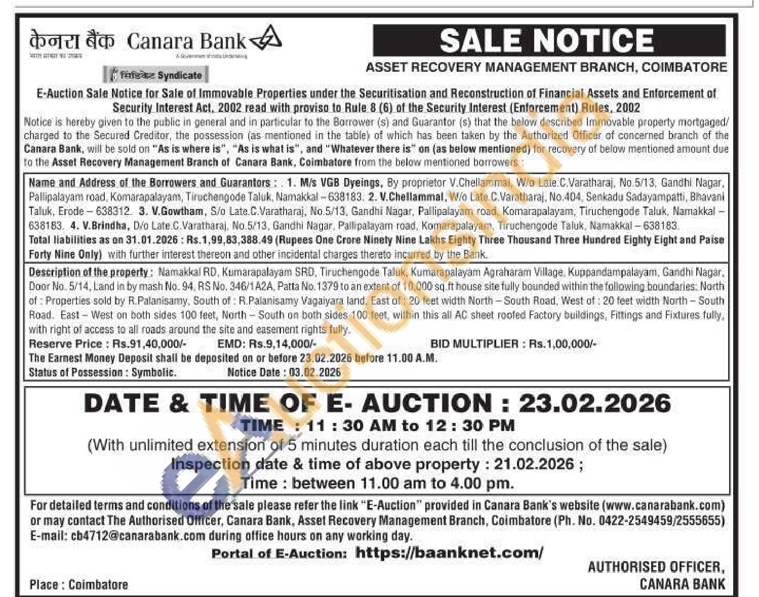 Description of the property: Namakkal RD, Kumarapalayam SRD, Tiruchengode Taluk, Kumarapalayam Agraharam Village, Kuppandampalayam, Gandhi Nagar, Door No. 5/14, Land in by mash No. 94, RS No. 346/1A2A, Patta No. 1379 to an extent of 10,000 sq.ft house site fully bounded within the following boundaries: North of: Properties sold by R.Palanisamy, South of: R.Palanisamy Vagaiyara land, East of: 20 feet width North-South Road, West of: 20 feet width North - South Road. East-West on both sides 100 feet, North-South on both sides 100 feet, within this all AC sheet roofed Factory buildings, Fittings and Fixtures fully, with right of access to all roads around the site and easement rights fully