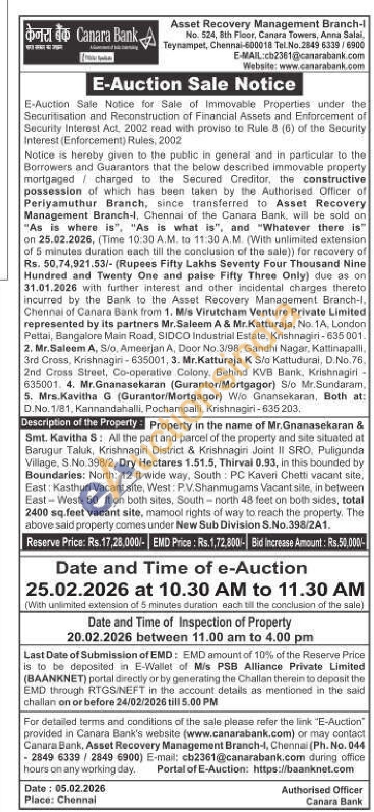 Property in the name of Mr.Gnanasekaran & Smt. Kavitha S: All the part and parcel of the property and site situated at Barugur Taluk, Krishnagiri District & Krishnagiri Joint II SRO, Puligunda Village, S.No.398/2, Dry Hectares 1.51.5, Thirvai 0.93, in this bounded by Boundaries: North: 12 ft wide way, South PC Kaveri Chetti vacant site, East: Kasthuri Vacant site, West. P.V.Shanmugams Vacant site, in between East-West-50 ft on both sites, South-north 48 feet on both sides, total 2400 sq.feet vacant site, mamool rights of way to reach the property. The above said property comes under New Sub Division S.No.398/2A1.