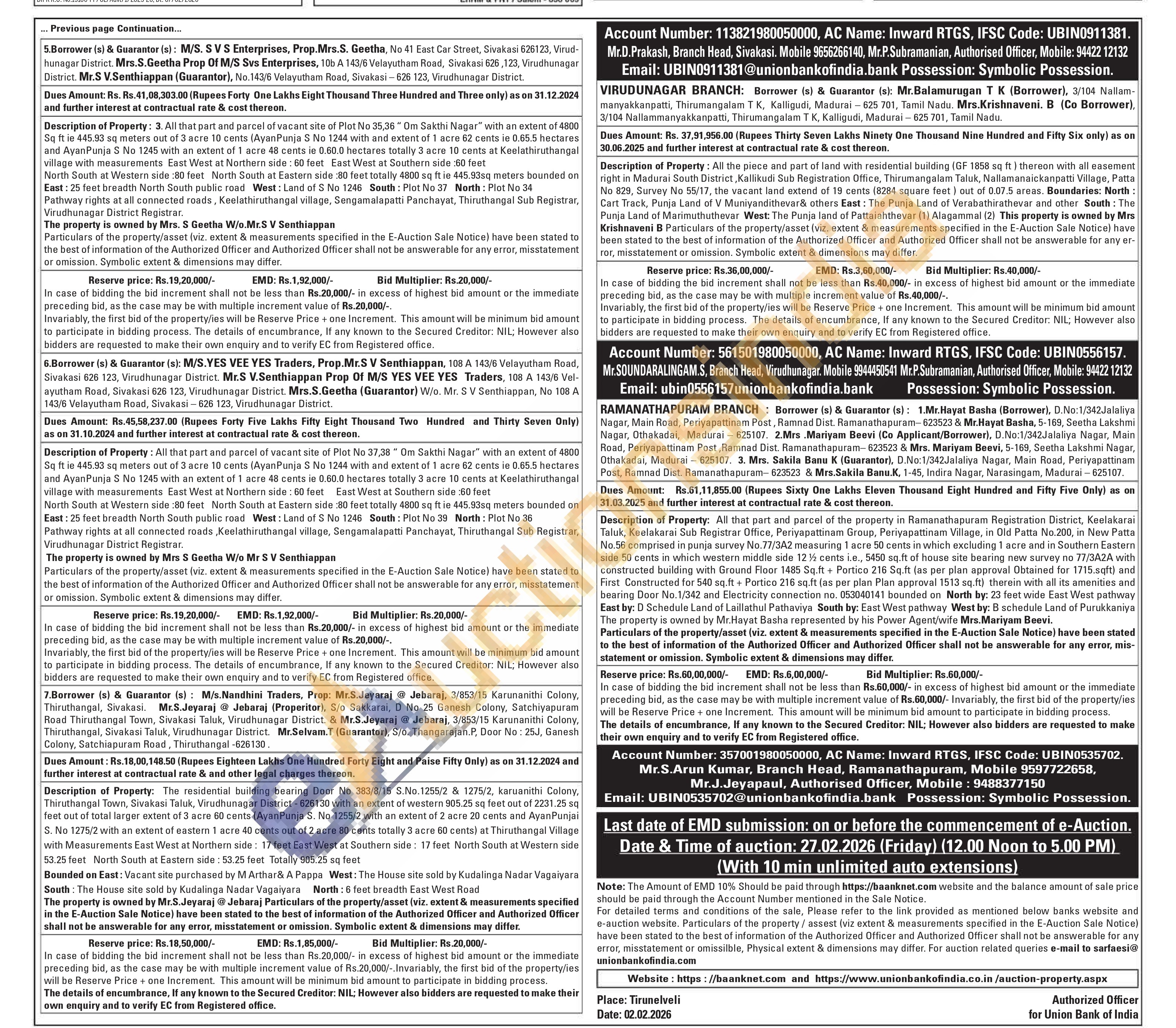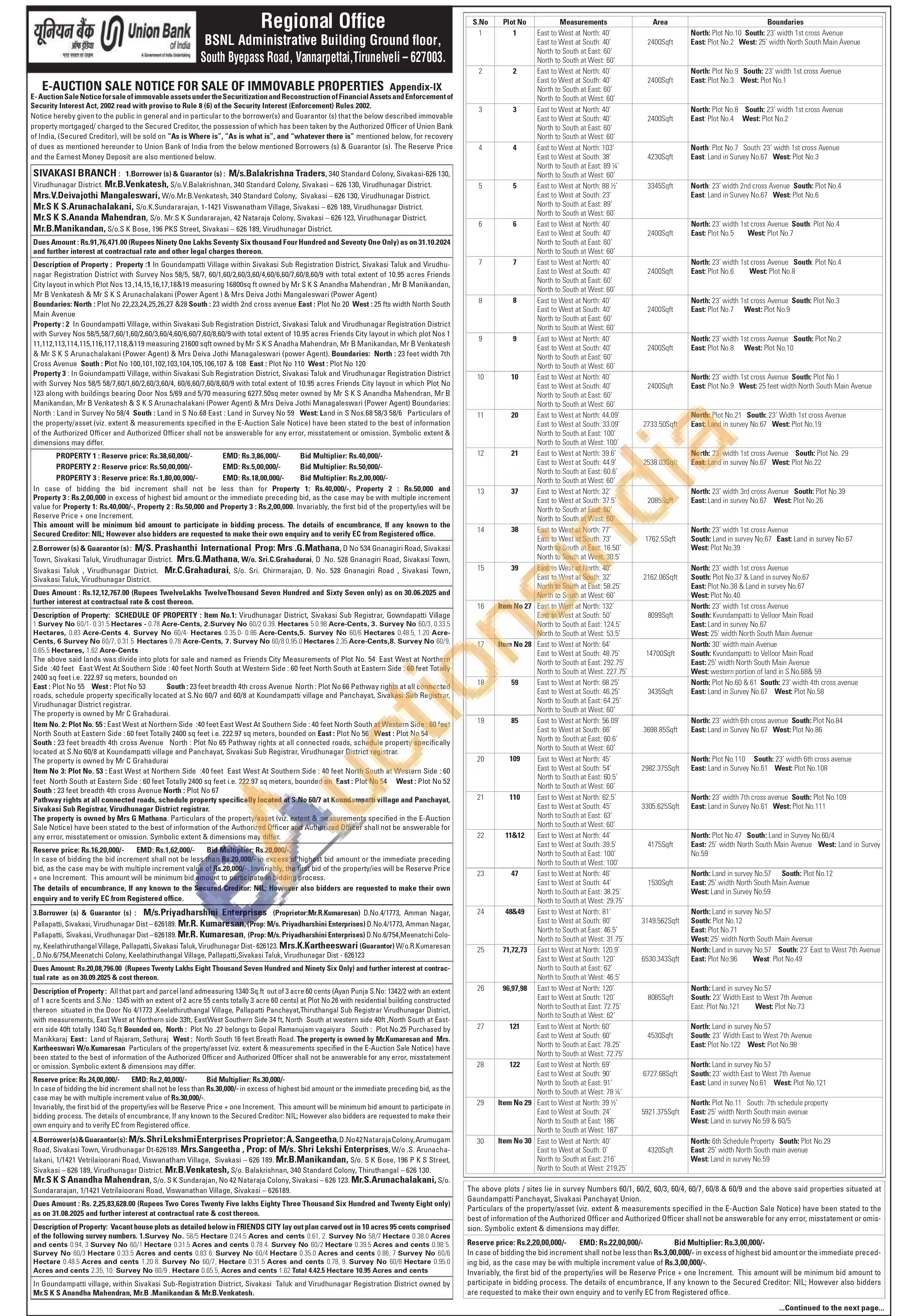 Description of Property: Property:1 In Goundampatti Village within Sivakasi Sub Registration District, Sivakasi Taluk and Virudhu-nagar Registration District with Survey Nos 58/5, 58/7, 60/1,60/2,60/3,60/4,60/6,60/7,60/8,60/9 with total extent of 10.95 acres Friends City layout in which Plot Nos 13,14,15,16,17,18&19 measuring 16800sq ft owned by Mr SKS Anandha Mahendran, Mr B Manikandan, Mr B Venkatesh & Mr SKS Arunachalakani (Power Agent) & Mrs Deiva Jothi Mangaleswari (Power Agent) Boundaries: North: Plot No 22,23,24,25,26.27 828 South: 23 width 2nd cross avenue East: Plot No 20 West: 25 fts width North South Main Avenue