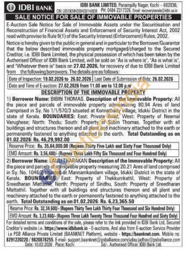 Description of the Immovable Property: All the piece and parcels of immovable property admeasuring 80.94 Ares of land Comprised in Sy. No 1/1/570/3 situated at Konnathady village, Idukki District in the state of Kerala. BOUNDARIES: East: Private Road, West: Property of Neemal Varughese, North: Thodu: South: Property of Subin Thomas. Together with all buildings and structures thereon and all plant and machinery attached to the earth or permanently fastened to anything attached to the earth