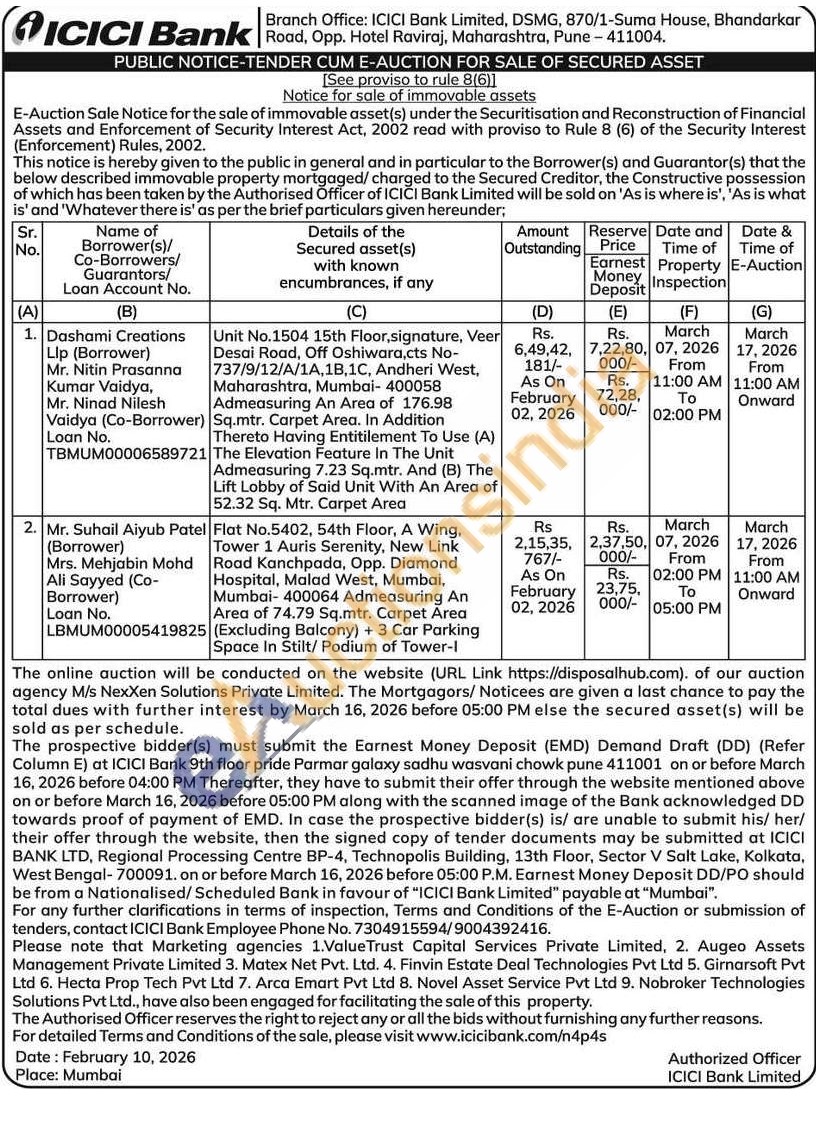 Flat No.5402, 54th Floor, A Wing. Tower 1 Auris Serenity, New Link Road Kanchpada, Opp. Diamond Hospital, Malad West, Mumbai, Mumbai-400064 Admeasuring An Area of 74.79 Sq.mtr. Carpet Area (Excluding Balcony) + 3 Car Parking Space In Stilt/ Podium of Tower-1