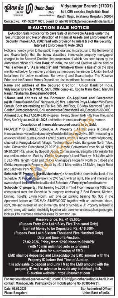 All that piece & parcel of immovable converted land property of residential bearing Sy. No. 29/4, measuring to an extent of 30% guntas, out of 1 acre 2 guntas, which is subject matter of property, situated at Keregudadahalli Village, Yeshwanthpur Hobli, Bangalore North Taluk, vide: Conversion Order dated 29.09.2011, in vide, Conversion Order No. ALN(NY) SR 81/2011-12, issued by Special Deputy Commissioner, Bangalore for residential use and bounded on: East by: Chikka Anjenappa's Land, West by: 9.14 Mtrs width x 83.5 Mtrs, length Road and Chikka Anjenappa's Property, North by: Road and Chikka Anjenappa's Property, South by: 9.14 Mtrs. width x 22.5 Mtrs, length Road and Lakeview Park No.2. Schedule 'B' Property (Un-divided share): An undivided share in the land of the Schedule 'A' Property equivalent to 246 Sq.ft with all right, title and interest and ownership of the land in the total land of Schedule 'A' Property referred to above. Schedule 'C' property: Flat bearing No.308 in Third Floor measuring 1082 sq.ft constructed over the Schedule 'A' property containing 2 Bed Rooms, Kitchen, Dinning, Toilet/s, Living Room, with one car parking bearing No. 308 in the Apartment known as "DS-MAX STARWOOD" together with an undivided share, right, title and interest of land in the total land of Schedule 'A' Property referred to above, along with water, electricity together with common areas such as passages, lobbies, lifts, staircase and other areas for common use.
