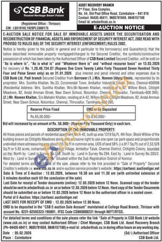 DESCRIPTION OF THE IMMOVABLE PROPERTY: All those pieces and parcels of residential apartment No.A-42, built up area 1319 Sq. Ft, 4th floor, Block Willow of the building known as Citilights Meadows along with exclusive right to use one open car park space and proportionate undivided share admeasuring area about 155 Sq. Ft in common area, UDS of land 58% (Le.817 Sq.Ft) out of 2,53,528 Sq.Ft or 5.82 acres, comprised in Nolambur Village, Ambattur Taluk, Chennai District, Citilights Colony, bounded on the: North by: Land in Survey No.318, South by: Land in Survey No.294, East by: Land in Survey No.303/2, West by: Land in Survey No.302/1A. Situated within the Sub Registration District of Konnur