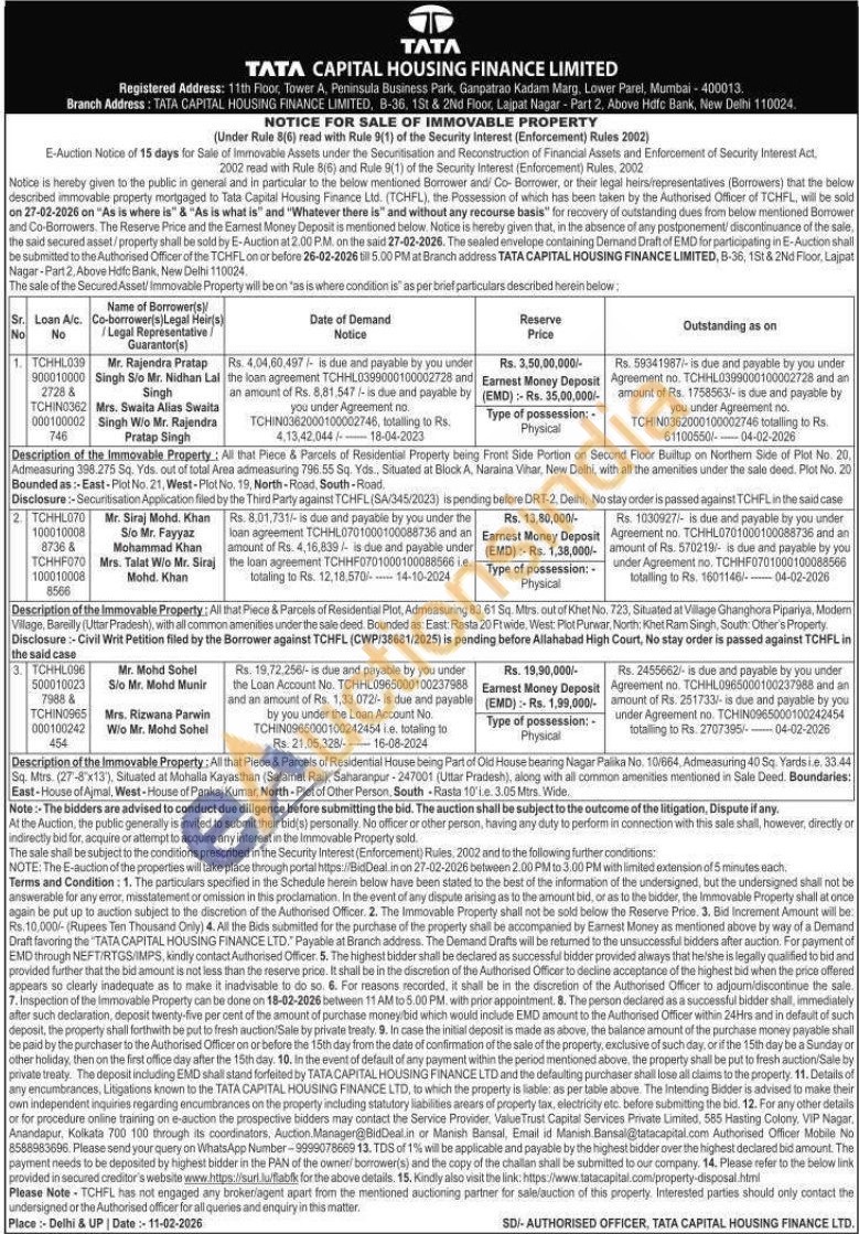Description of the Immovable Property: All that Piece & Parcels of Residential Plot, Admeasuring 83.61 Sq. Mtrs. out of Khet No. 723, Situated at Village Ghanghora Pipariya, Modem Vilage, Bareilly (Uttar Pradesh), with all common amenities under the sale deed. Bounded as: East: Rasta 20 Ft wide, West: Plot Purwar, North: Khet Ram Singh, South: Other's Property Disclosure:- Civil Writ Petition filed by the Borrower against TCHFL (CWP/38681/2025) is pending before Allahabad High Court, No stay order is passed against TCHFL in the said case