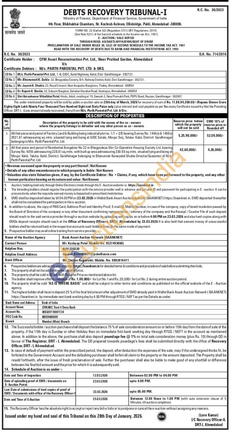 All that piece and parcel of Factory Land & Building being industrial plot no. 1/1+2/B bearing Survey No. 1464/p & 1466/p 2921.81 admeasuring sq.mtrs. situated lying and being at GIDC Estate, Mouje: Saij, Taluka: Kalol, District: Gandhinagar belonging to M/s. Parth Parental Pvt. Ltd