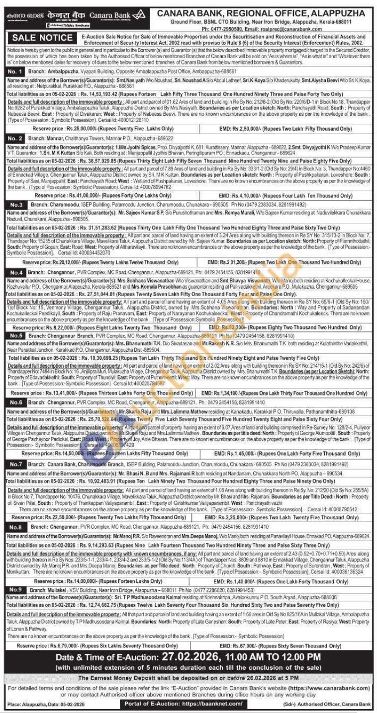 Details and full description of the immovable property with known encumbrances, if any: All part and parcel of land having an extent of 2.43 (0.52+0.70+0.71+0.50) Ares along with building thereon in Re Sy Nos: 233/5-1-1, 233/4-1, 233-4-2 and 233/5-1-2 (Old Sy No. 113/4A) of Thandapper Nos: 8809 and 88 10 in Ennakkad Village, Chengannur Taluk Alappuzha District owned by Mr.Manoj PR. and Mrs. Deepa Manoj. Boundaries as per Title deed: North: Property of Church, South: Pathway, East: Property of Surendran, West: Property of Monikuttan. There are no known encumbrances on the above property as per the knowledge of the bank [Type of Possession- Symbolic Possession). Cersai Id: 400036136324