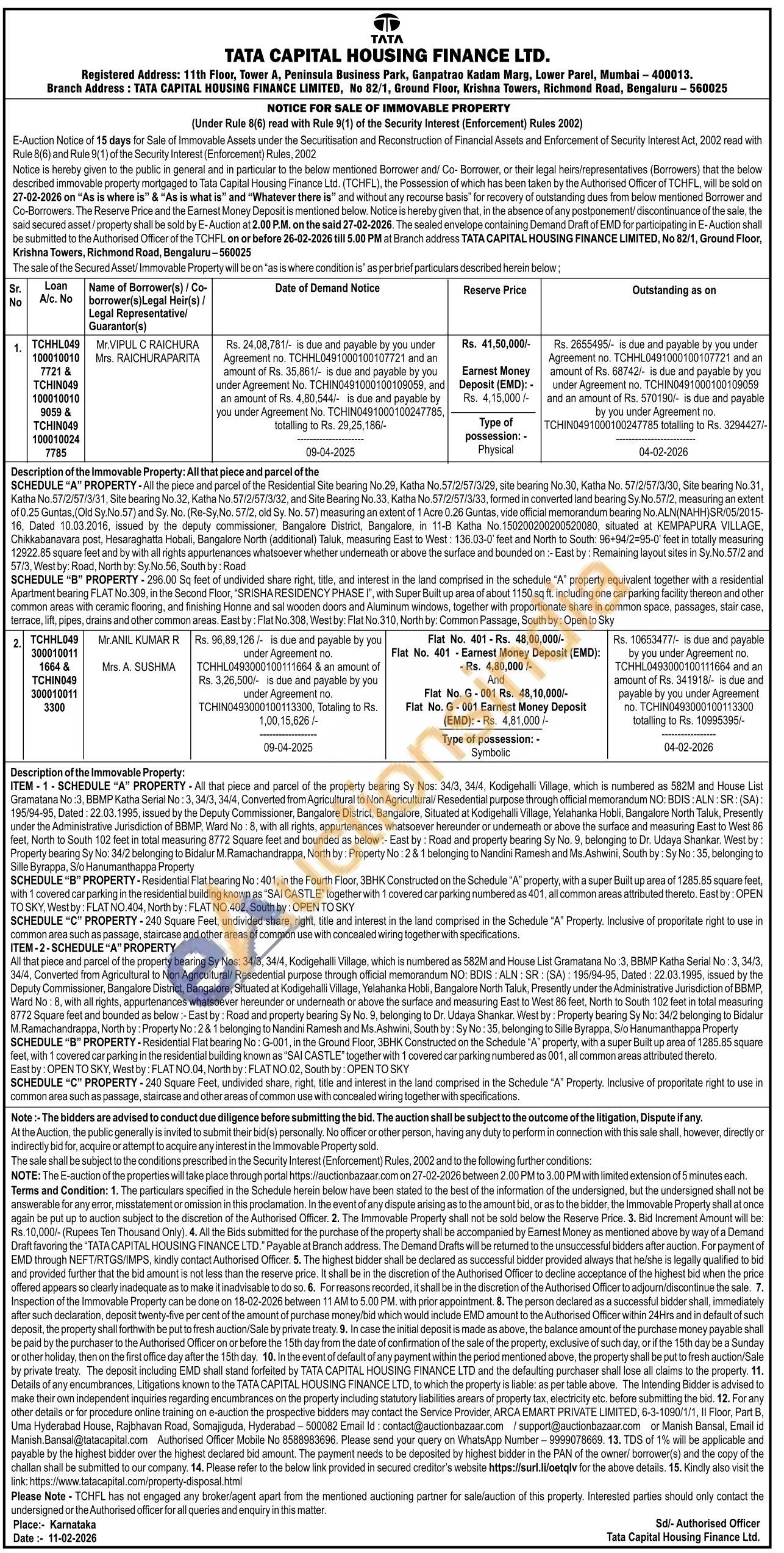 All that piece and parcel of the property bearing Sy Nos: 34/3, 34/4, Kodigehalli Village, which is numbered as 582M and House List Gramatana No :3, BBMP Katha Serial No: 3, 34/3, 34/4, Converted from Agricultural to Non Agricultural/ Resedential purpose through official memorandum NO: BDIS: ALN: SR: (SA): 195/94-95, Dated: 22.03.1995, issued by the Deputy Commissioner, Bangalore District, Bangalore, Situated at Kodigehalli Village, Yelahanka Hobli, Bangalore North Taluk, Presently under the Administrative Jurisdiction of BBMP, Ward No: 8, with all rights, appurtenances whatsoever hereunder or underneath or above the surface and measuring East to West 86 feet, North to South 102 feet in total measuring 8772 Square feet and bounded as below :- East by: Road and property bearing Sy No. 9, belonging to Dr. Udaya Shankar. West by: Property bearing Sy No: 34/2 belonging to Bidalur M.Ramachandrappa, North by: Property No: 2 & 1 belonging to Nandini Ramesh and Ms. Ashwini, South by: Sy No: 35, belonging to Sille Byrappa, S/o Hanumanthappa Property SCHEDULE "B" PROPERTY - Residential Flat bearing No: G-001, in the Ground Floor, 3BHK Constructed on the Schedule "A" property, with a super Built up area of 1285.85 square feet, with 1 covered car parking in the residential building known as "SAI CASTLE" together with 1 covered car parking numbered as 001, all common areas attributed thereto.