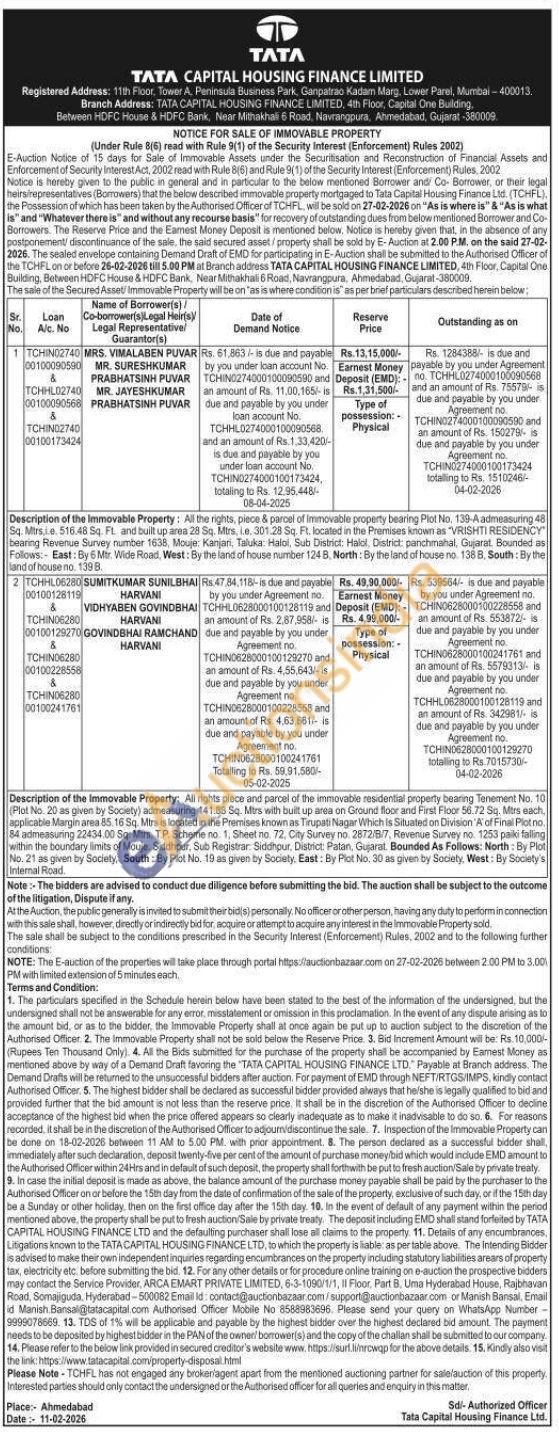 Description of the Immovable Property: All rights piece and parcel of the immovable residential property bearing Tenement No. 10 (Plot No. 20 as given by Society) admeasuring 141.88 Sq. Mtrs with built up area on Ground floor and First Floor 56.72 Sq. Mtrs each, applicable Margin area 85.16 Sq. Mtrs is located in the Premises known as Tirupati Nagar Which Is Situated on Division 'A' of Final Plot no. 84 admeasuring 22434.00 Sq. Mtrs, T.P. Scheme no. 1, Sheet no. 72, City Survey no. 2872/8/7, Revenue Survey no. 1253 paiki falling within the boundary limits of Mouje: Siddhpur, Sub Registrar: Siddhpur, District: Patan, Gujarat Bounded As Follows: North: By Plot No. 21 as given by Society, South: By Plot No. 19 as given by Society, East: By Plot No. 30 as given by Society, West: By Society's Internal Road