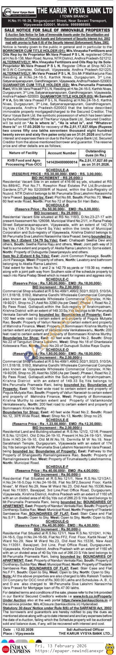 Residential Flat Situated at R.S.No. 121/1, New R.S.No. 121/2A1, H.No.24-16-5,Opp H.No.24-16-59, Flat No.SF2, Second Floor, Kartik Nivas", M Ward No.29, New M Ward No. 23, Old Asst No. 15336, New Asst No. 113051, Bavajipet, 3rd Line, Post Office Road, Durgapuram, Vijayawada, Kirshna District, Andhra Pradesh with an extent of 1160 sft with an un divided area of 40 Sq. Yds out of 266.23 S.Yds land belongs to Mr.Perumalla Prameela Rani, being bounded by: BOUNDARIES OF APARTMENT: East: Property of Nanduri Venkata Rao, South: Property of Dontharaju Subba Rao, West: Municipal Road, North: Property of Thadanki Sambasiva Rao BOUNDARIES OF FLAT: East: Stair Case and Flat No.S.F1, South: Open to Sky, West: Open to Sky, North: Open to Sky