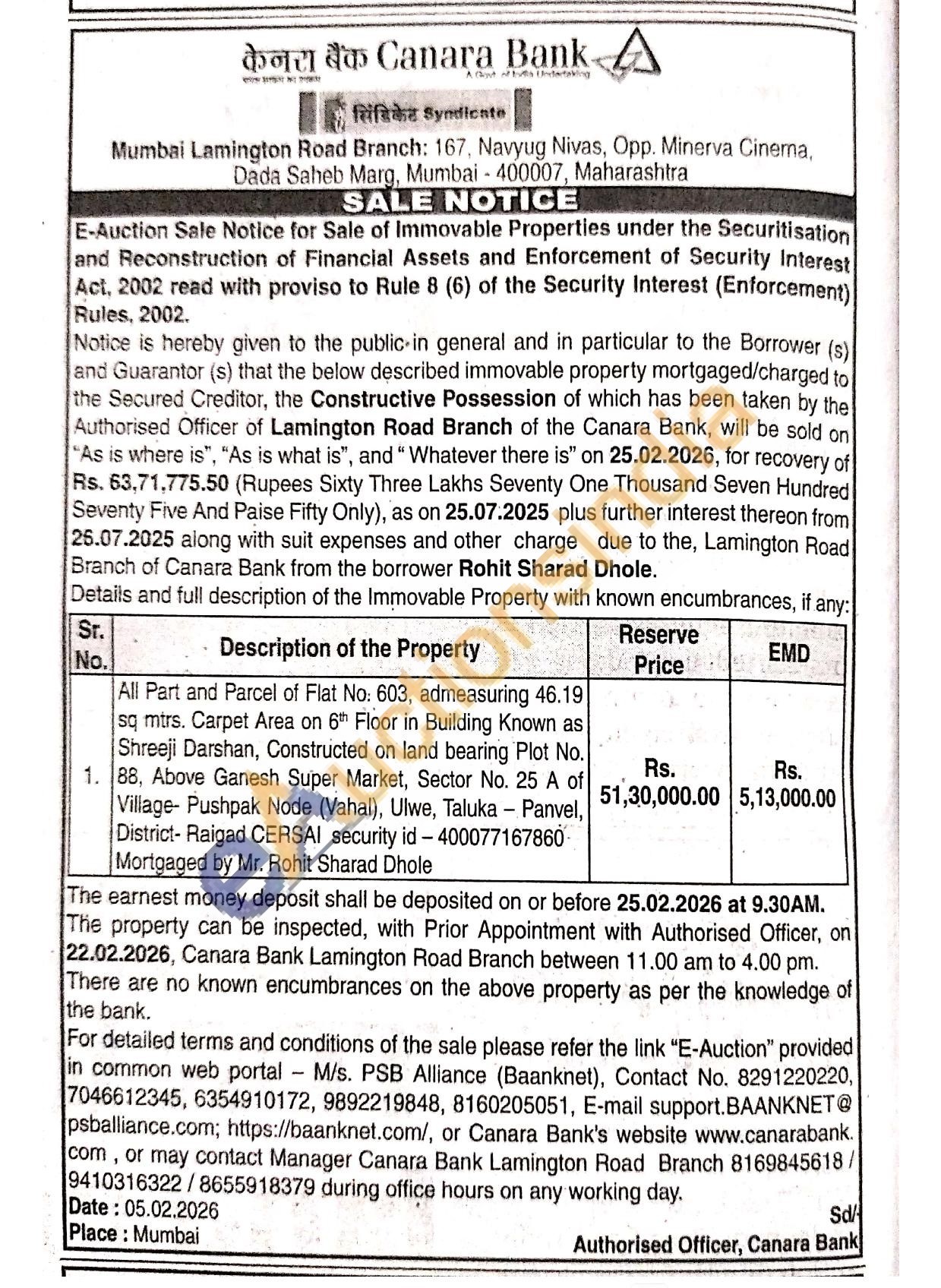 All Part and Parcel of Flat No: 603, admeasuring 46.19 sq mtrs. Carpet Area on 6th Floor in Building Known as Shreeji Darshan, Constructed on land bearing Plot No. 88, Above Ganesh Super Market, Sector No. 25 A of Village- Pushpak Node (Vahal), Ulwe, Taluka - Panvel, District- Raigad CERSAI security id-400077167860 Mortgaged by Mr. Rohit Sharad Dhole