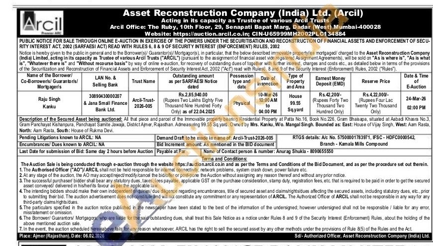 Description of the Secured Asset being auctioned: All that piece and parcel of the Immovable property bearing Residential Property at Patta No.16, Book No.226. Gram Bhaisapa, situated at Aabad Khasra No.3, Gram Panchayat Kishanpura, Panchayat Samite Jawaja, District Ajmer, Rajasthan. Admeasuring 99.55 Sq yard. Owned by Mrs. Kanku, W/o. Mangal Singh. Bounded as: East: House of Vijay Singh, West: Aam Rasta, North: Aam Rasta, South: House of Rukma Devi