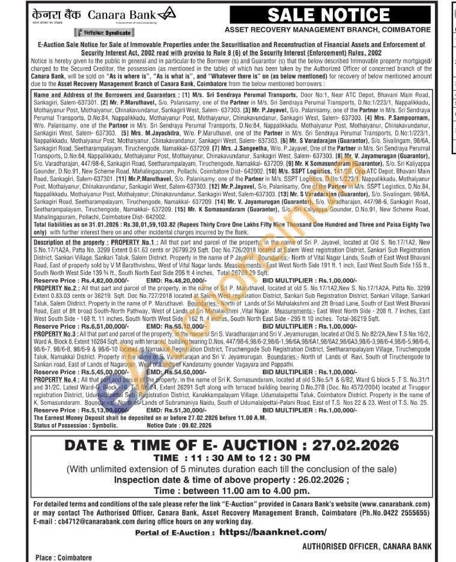 PROPERTY No.3: All that part and parcel of the property, in the name of Sri S. Varadharajan and Sri V. Jeyamurugan, located at Old S. No.82/2A, New T.S No.16/2. Ward A. Block 8. Extent 16284 Sqft. along with terraced building bearing D.Nos. 447/98-6,98/6-2.98/6-198/64,98/6A1,98/642,98/6A3,98/6-3,98/6-4,98/6-5,98/6-6, 98/6-7, 98/6-8, 98/6-9 & 96/6-10 located at Namakkal Registration District, Tiruchengode Sub Registration District, Seetharampalayam Village, Tiruchengode Talluk, Namakkal District, Property in the name of S. Varadharajan and Sri V. Jeyamurugan. Boundaries: North of Lands of Ravi, South of Tiruchengode to Sankari road, East of Lands of Nagarajan, West of Lands of Kandasarny gounder Vagayara and Pappathi.