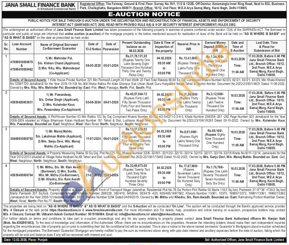 Details of Secured Assets: 1 Kitta House Private Number 221 Min Paimaish Length 30 Feet Width 20 Feet Total Rakaba 66.66 Sq Gaj Comprised Khasra Number 62//20, 62//21, 63//21, 63//25, Min Khata Khatoni No.1259/1720 Jamabandi for the Year 2018-19 H.B No.368 Wakia Rakba Pin Kala Ghanpur Sub Urban Abadi Guru Hargobind Nagar Tehsil & District Amritar, Document No.2022-23/93/1/4631 Dated 11-08-2022. Owned by Mrs. Ritu, W/o. Mahinder Pal. Bounded by: East: Plot, West: Passage, North: Plot, South: Plot