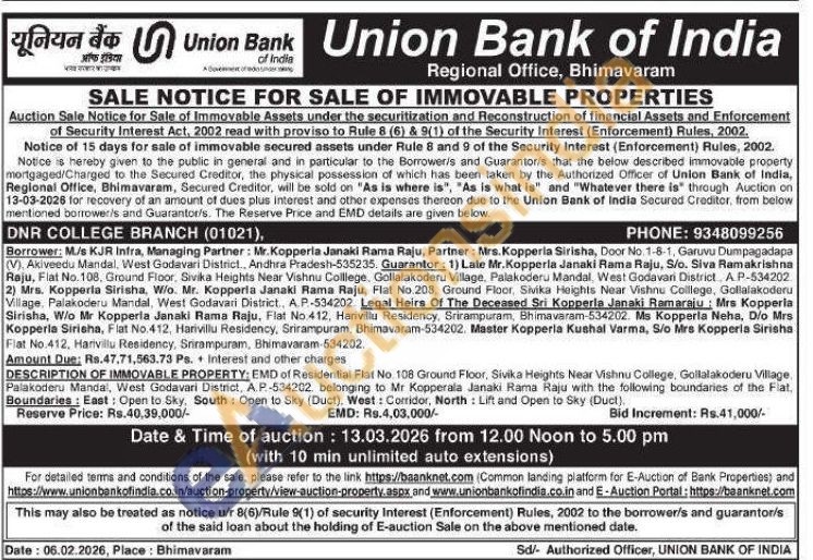 DESCRIPTION OF IMMOVABLE PROPERTY: EMD of Residential Flat No. 108 Ground Floor, Sivika Heights Near Vishnu College, Gollalakoderu Village. Palakoderu Mandal, West Godavari District, A.P-534202, belonging to Mr Kopperala Janaki Rama Raju with the following boundaries of the Fiat, Boundaries: East: Open to Sky, South: Open to Sky (Duct), West: Corridor, North: Lift and Open to Sky (Duct)