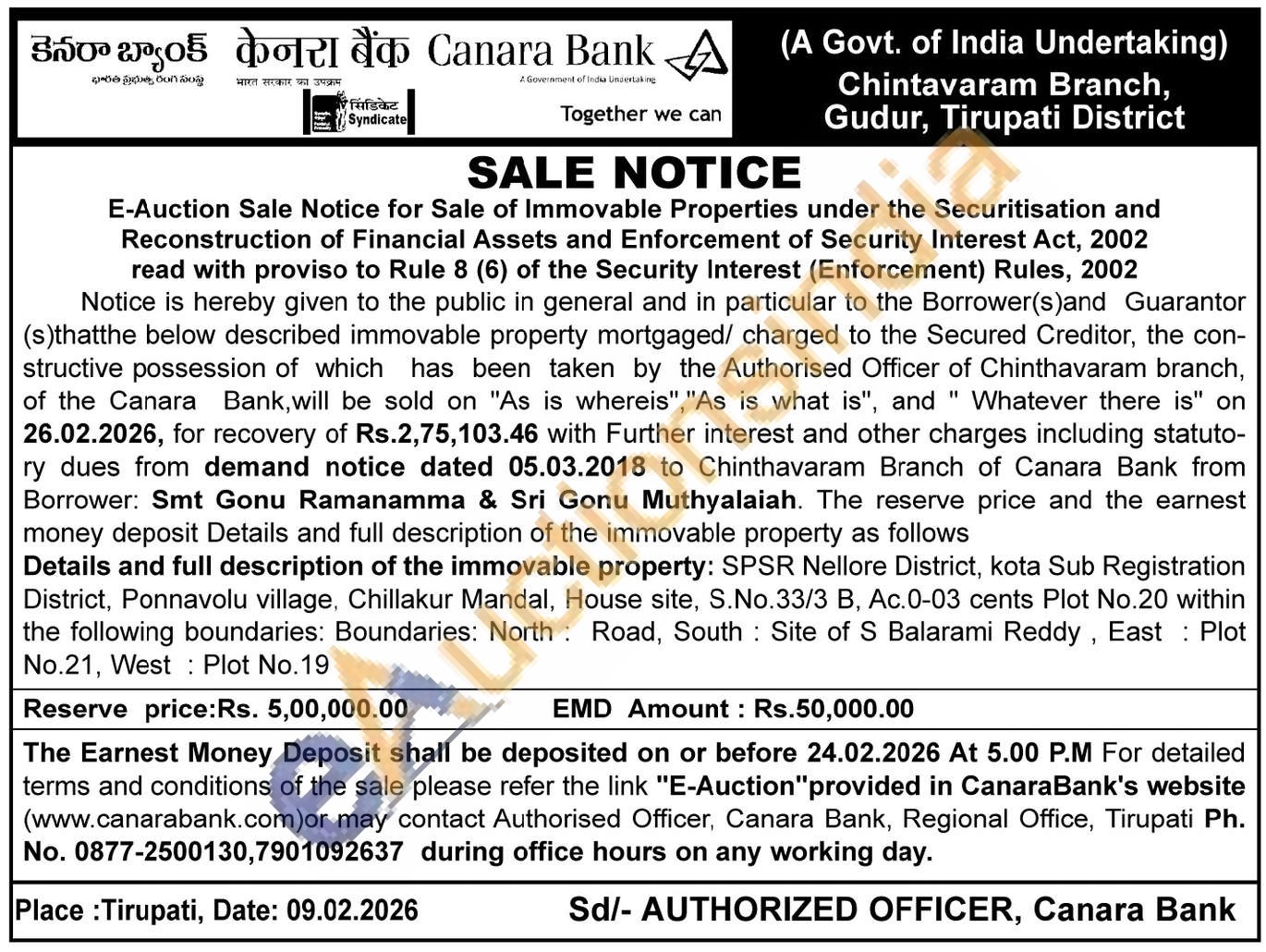 Details and full description of the immovable property: SPSR Nellore District, kota Sub Registration District, Ponnavolu village, Chillakur Mandal, House site, S.No.33/3 B, Ac.0-03 cents Plot No.20 within the following boundaries: Boundaries: North Road, South Site of S Balarami Reddy, East: Plot No.21, West: Plot No.19
