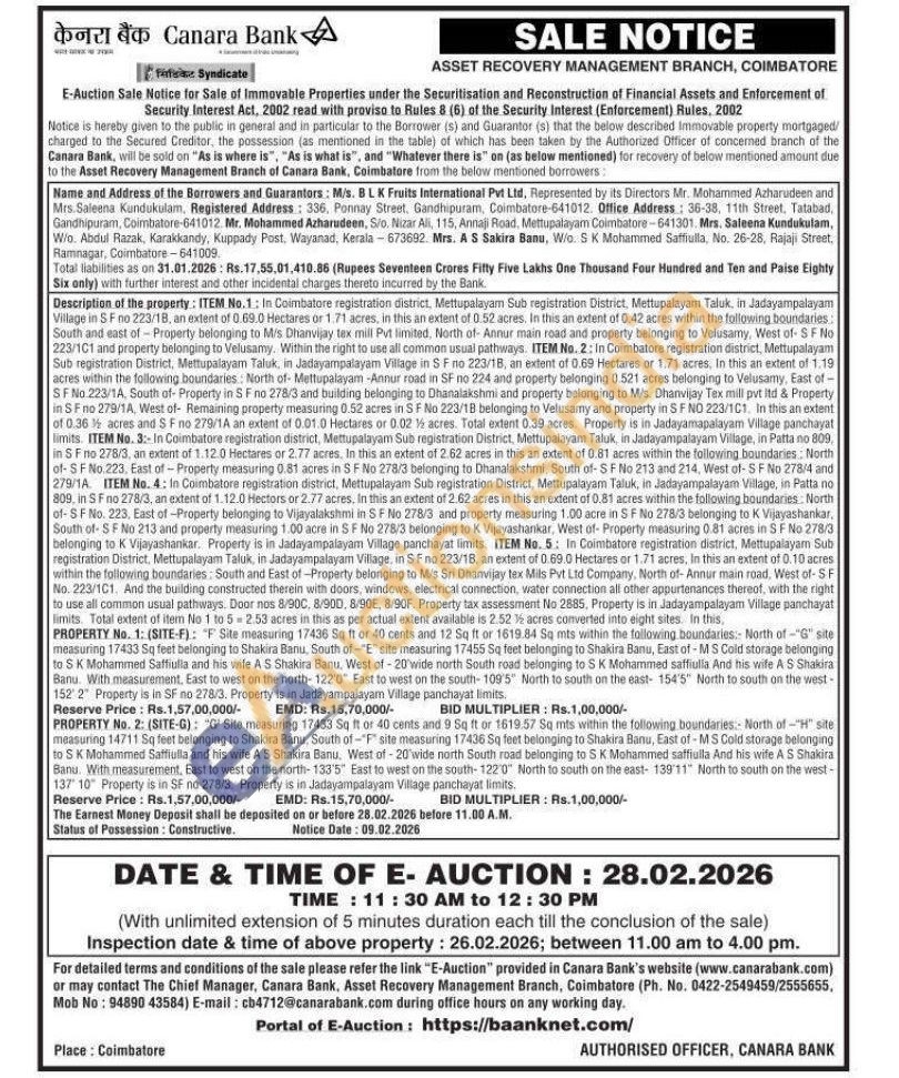 "G' Site measuring 17433 Sq ft or 40 cents and 9 Sq ft or 1619.57 Sq mts within the following boundaries: North of "H" site measuring 14711 Sq feet belonging to Shakira Banu, South of "F" site measuring 17436 Sq feet belonging to Shakira Banu, East of - MS Cold storage belonging to S K Mohammed Saffiulla and his wife A S Shakira Banu, West of 20 wide north South road belonging to S K. Mohammed saffiulla And his wife A S Shakira Banu. With measurement, East to west on the north-133'5" East to west on the south-122'0" North to south on the east- 139'11" North to south on the west- 137 10 Property is in SF no 278/3. Property is in Jadayampalayam Village panchayat limits