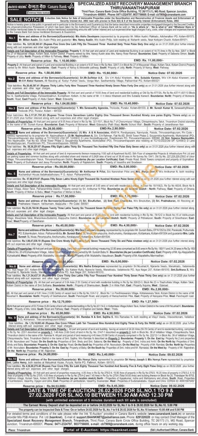 Details of Property/les: As that part and parcel of properties measuring, 4.05 Ares in Re Sy No 276/2-4, 16.80 Ares of property in Re Sy No 276/3 16.20 Ares of property in 275/3-2, 6.10 Ares of property in Re Sy No 275/5, 4.05 Ares of property in Re Sy No 275/4-2 and 7.45 Ares in Re Sy No 275/4 (Total 54.65 Ares) and building thereon in Block. No 20, Thandaper No 8753 Pallimon Village. Kolam Taluk, Kollam 691515. Boundaries (as per location sketch) North Properties of Ajayakumar, Indira and Mahilamony and others, South: Road, Properties of Lambodaran, Vasanthy, Vijayan and Usha, East: Properties of Lambodaran, Vasanthy, Sivanandan, West: Properties of Sudarsanababu, Vijayan and Chira CERSAI ID: 400015875497
