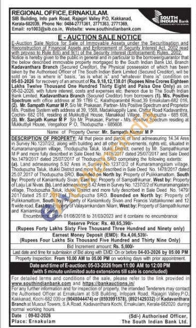 DESCRIPTION OF PROPERTY: All that piece and parcel of land admeasuring 14.34 Ares in Survey No. 1237/2/2, along with building and all other improvements, nights etc, situated in Kumaramangalam village, Thodupuzha Taluk, Idukki District, owned by Mr. Sampathkumar MP and more fully described in Sale Deed No. 1478/2017 dated 25/07/2017 and Sale Deed No.1479/2017 dated 25/07/2017 of Thodupuzha SRO comprising the following extents: (a). Land admeasuring 5.92 Ares in Survey No. 1237/2/2 of Kumaramangalam village. Thodupuzha Taluk, Idukki District and more fully described in Sale Deed No. 1478/2017 dated 25.07.2017 of Thodupuzha SRO. Bounded on North by: Property of Pulikkamattom, South by: Property of Kaniamkudy Sivan. East by: Property of Sampathkumar, West by: Property of Laju Lal Nivas. (b). Land admeasuring 8.42 Ares in Survey No. 1237/2/2 of Kumaramangalam village, Thodupuzha Taluk, Idukki District and more fully described in Sale Deed No. 1479/2017dated 25.07.2017 of Thodupuzha SRO. Bounded on North by: Property of Pulikkamattom, South by: Property of Kaniamkudy Sivan and Francis Vattakkunnel and 12 ft wide road, East by: Property of Valayamkandam Nilan, West by: Property of Sampath kumar and Kaniamkudy Sivan