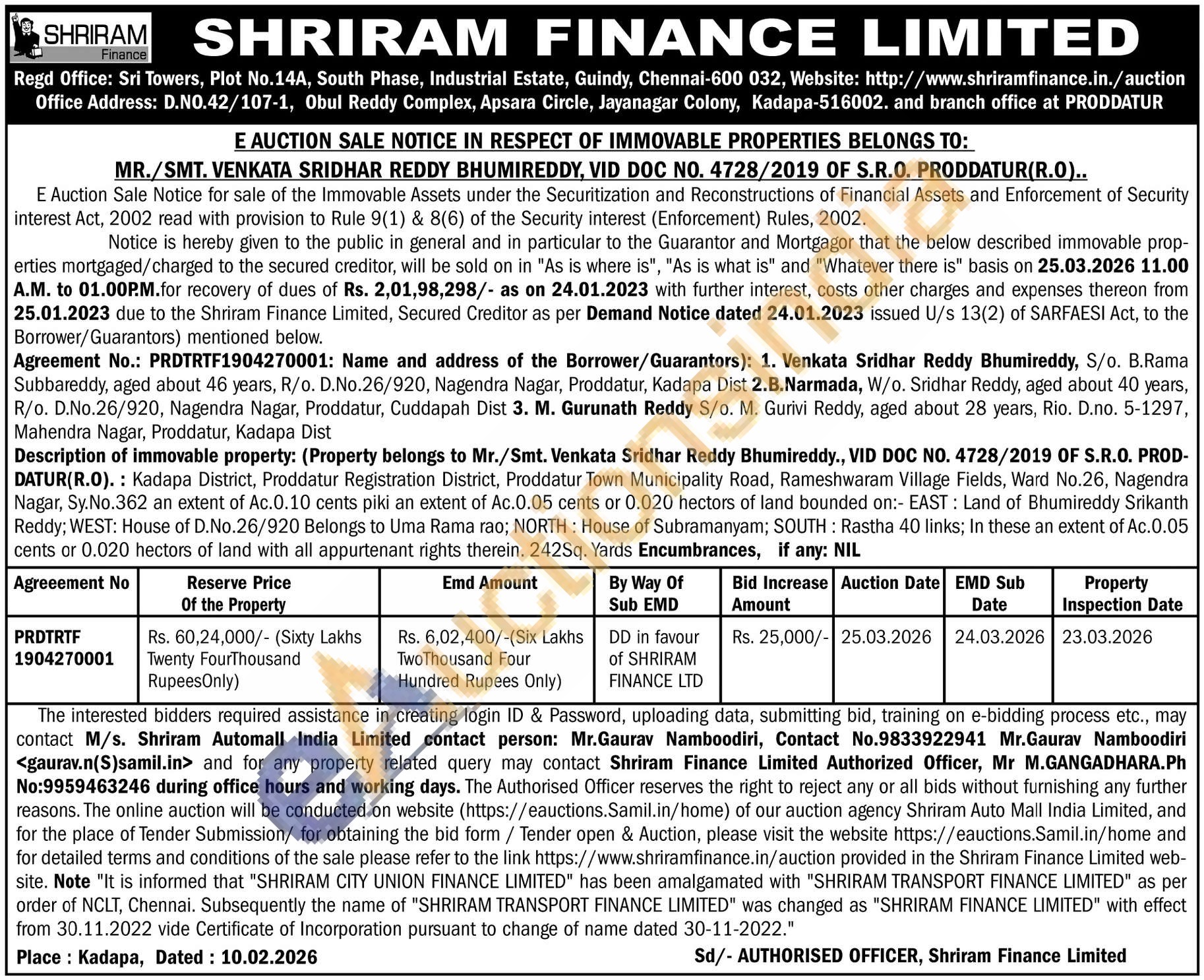 Kadapa District, Proddatur Registration District, Proddatur Town Municipality Road, Rameshwaram Village Fields, Ward No.26, Nagendra Nagar, Sy.No.362 an extent of Ac.0.10 cents piki an extent of Ac.0.05 cents or 0.020 hectors of land bounded on:- EAST: Land of Bhumireddy Srikanth Reddy; WEST: House of D.No.26/920 Belongs to Uma Rama rao; NORTH: House of Subramanyam; SOUTH: Rastha 40 links; In these an extent of Ac.0.05 cents or 0.020 hectors of land with all appurtenant rights therein. 242Sq. Yards Encumbrances, if any: NIL