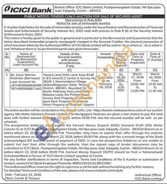 Vacant Land With Land Area 9149. In 8.5 Ares (15.2 Cents) In Survey No. 362/6-1 Nenmanikara Village, Mukundhapuram Taluk, Thrissur District-680301. Bounded On The North: Pathway And Land South: Balance Land, 5m Private Road Access And Property of Chirayath jiyon East: Property of Shyama West: Property of Avannali Vijayan