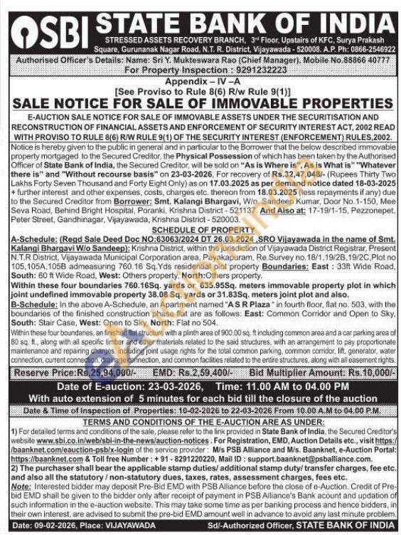 A-Schedule: (Regd Sale Deed Doc NO:63063/2024 DT 26.03.2024, SRO Vijayawada in the name of Smt. Kalangi Bhargavi W/o Sandeep): Krishna District, within the jurisdiction of Vijayawada District Registrar, Present N.T.R District, Vijayawada Municipal Corporation area, Payakapuram, Re Survey no. 18/1,19/28, 19/2C, Plot no 105.105A,105B admeasuring 760.16 Sq. Yds residential plot property Boundaries: East: 33ft Wide Road, South: 60 ft Wide Road, West: Others property, North: Others property. Within these four boundaries 760.165q. yards or 635.955q. meters immovable property plot in which joint undefined immovable property 38.08 Sq. yards or 31.83Sq. meters joint plot and also. B-Schedule: in the above A-Schedule, an Apartment named "ASR Plaza" in fourth floor, flat no. 503, with the boundaries of the finished construction phase flat are as follows. East: Common Corridor and Open to Sky, South: Stair Case, West: Open to Sky, North: Flat no 504. Within these four boundaries, an finished flat structure with a plinth area of 900.00 sq. ft including common area and a car parking area of 80 sq. ft, along with all specific timber and other materials related to the said structures, with an arrangement to pay proportionate maintenance and repairing charges, including joint usage rights for the total common parking, common corridor, lift, generator, water connection, current connection, drainage connection, and common facilities related to the entire structures, along with all easement rights