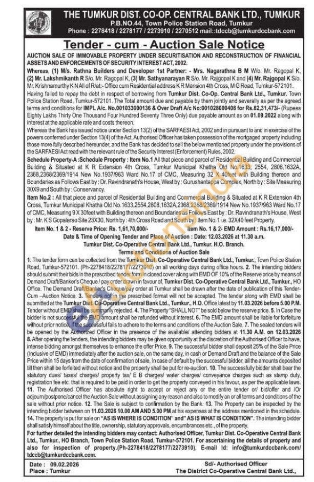 Schedule Property-A:Schedule Property: Item No.1 All that piece and parcel of Residential Building and Commercial Building & Situated at KR Extension 4th Cross, Tumkur Municipal Khatha Old No.1633, 2554, 2808,16324, 2368,2368/2369/1914 New No.1937/963 Ward No.17 of CMC, Measuring 32 X 40feet with Building thereon and Boundaries as Follows East by: Dr. Ravindranath's House, West by: Gurushantappa Complex, North by: Site Measuring 30X9 and South by: Conservancy. Item No.2: All that piece and parcel of Residential Building and Commercial Building & Situated at KR Extension 4th Cross, Tumkur Municipal Khatha Old No. 1633,2554,2808, 16324,2368,2368/2369/1914 New No. 1937/963 Ward No.17 of CMC, Measuring 9X 30feet with Building thereon and Boundaries as Follows East by: Dr. Ravindranath's House, West by: Mr. KS Gopalarao Site 23X30, North by: 4th Cross Road and South by: Item No. 11.e. 32X40 feet Property.