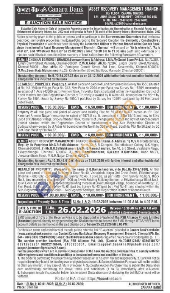 Property 2: All that piece and parcel of vacant land bearing Plot No 55 of the layout named as 'Sri Devi Karumari Amman Nagar measuring an extent of 2973.5 sq. ft. comprised in S.No 65/13 and now in S.No 65/51 of kuthangor village, Sriperumbadur Taluk, formerly of Chengalpattu District and now of Kancheepuram District situated within the Registration District of Kancheepuram and Sub Registration District of Guduvancherry owned by U Akbar Ali bounded on the North by 30 Feet Road, South by Plot No 56, East by 30 Feet Road, West by Plot No 57.