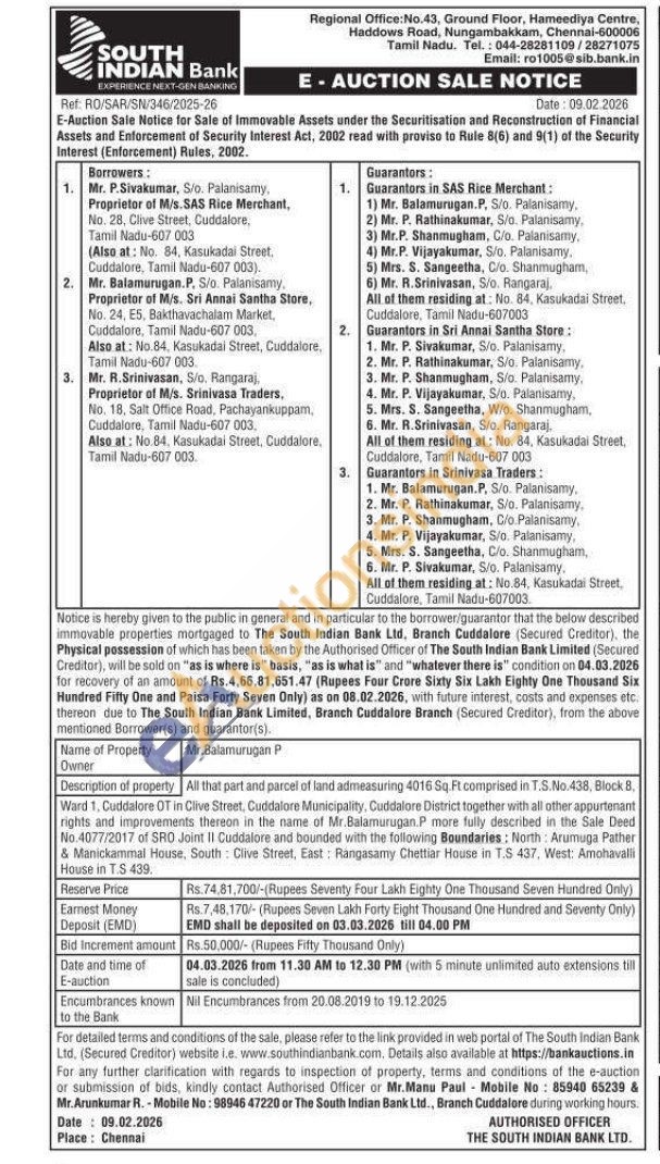All that part and parcel of land admeasuring 4016 Sq. Ft. comprised in T.S.No.438, Block B. Ward 1, Cuddalore OT in Clive Street, Cuddalore Municipality, Cuddalore District together with all other appurtenant rights and improvements thereon in the name of Mr.Balamurugan P more fully described in the Sale Deed No.4077/2017 of SRO Joint II Cuddalore and bounded with the following Boundaries: North: Arumuga Pather & Manickammal House, South Clive Street, East: Rangasamy Chettiar House in T.S 437, West: Amohavalli House in TS 439.