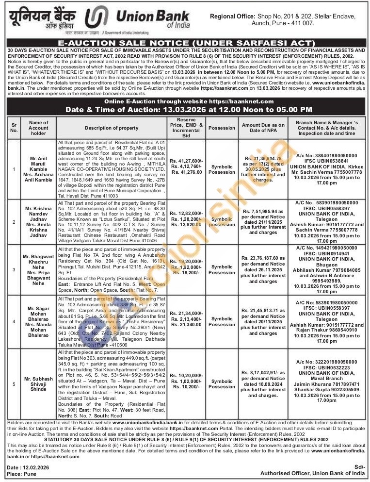 All that the piece and parcel of immovable property being Flat No 303, admeasuring 449.0 sq.ft. (carpet 345.0 sq. ft) parking area admeasuring 100 sq. ft. in the building "Sai Kiran Apartment" constructed an Plot no. 46, S. No. 53+54/4+55/2+56/3+54/2 situated At Vadgaon, Ta Maval, Dist- Pune within the limits of Vadgaon Nagar panchayat and the registration District Pune, Sub Registration District and Taluka - Maval.Boundaries of the Property (Residential Flat No. 306) East: Plot No. 47, West: 30 feet Road, North: S. No. 7, South: Road