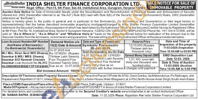 Description Of The Immovable Property/Secured Asset: All Piece And Parcel Of Patta No 6792, Gram Dariba, Gp Mehenduriya, Ps Railmagra, dist Rajasamand, Rajasthan 313211, Udaipur Boundary:-East-Ram La Salvi-House, West-Bhagwan Lal Ji-Plot, North-House-Amar Singh, South-Aam Rasta