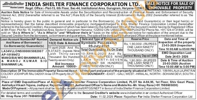 Description Of The Immovable Property/Secured Asset: All that part and parcel of the property situated at PATTANO. 109/99 LALA LAJPAT RAI COLONY JODHPUR RAJ 342001 Area Of Property 84.27 SQ. Yard BOUNDARY:-EAST: -GALI, WEST:-HIRALAL, NORTH: -SOHANI DEVI, SOUTH: GALI