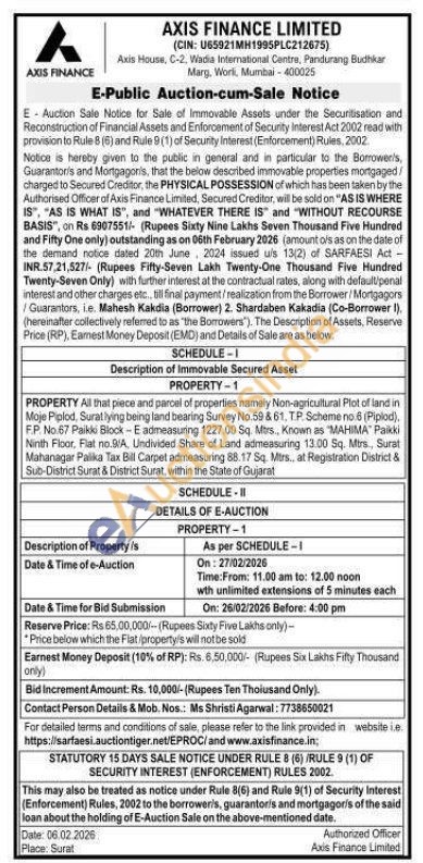 PROPERTY All that piece and parcel of properties namely Non-agricultural Plot of land in Moje Piplod, Surat lying being land bearing Survey No.59 & 61. T.P. Scheme no.6 (Piplod), F.P. No.67 Paikki Block-E admeasuring 1227,00 Sq. Mtrs., Known as "MAHIMA" Paikki Ninth Floor, Flat no.9/A, Undivided Share of Land admeasuring 13.00 Sq. Mtrs, Surat Mahanagar Palika Tax Bill Carpet admeasuring 88.17 Sq. Mtrs.. at Registration District & Sub-District Surat & District Surat, within the State of Gujarat