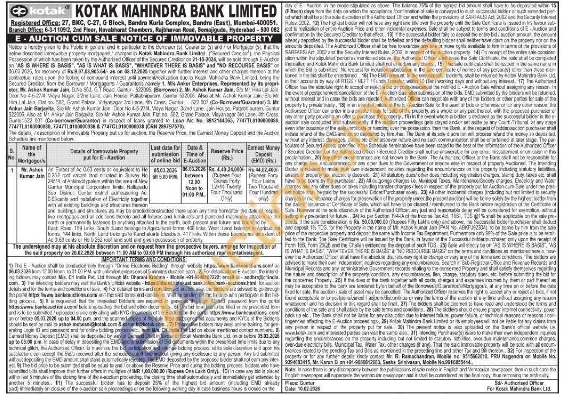 An Extent of Ac 0.63 cents or equivalent to He 0.252 roof vacant land situated in Survey No 245/4 of Ankireddypalem within the area of New Guntur Municipal Corporation limits, Nallapadu Sub District, Guntur district admeasuring Ac. 0.63cents and installation of Electricity together with all existing buildings and structures thereon and buildings and structures as may be erected constructed there upon any time from/after the date of respec-five mortgages and all additions thereto and all fixtures and fumiture's and plant and machinery attached to the earth or permanently fastened to anything attached to the earth, both present and future and bounded by East: Road, 159 Links, South Land belongs to Agricultural forms, 408 links, West: Land belongs to Agricultural forms, 144 links, North: Land belongs to Kunchakaria Elizebath, 417 links Within these boundaries an extent of Ac 0.63 cents or He 0.252 roof land sold and given possession of property