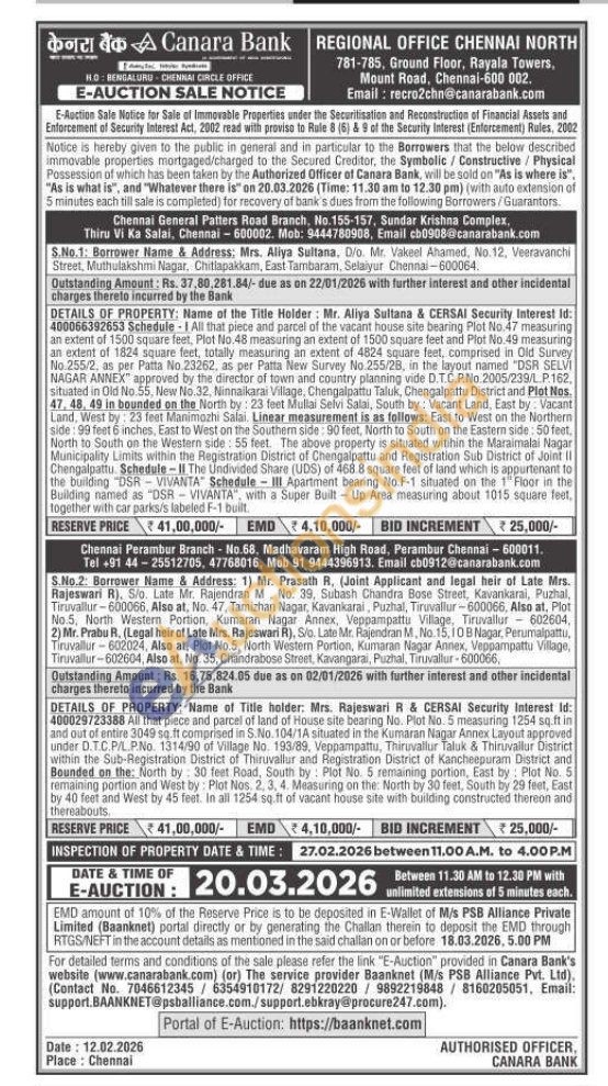 1) All that piece and parcel of the vacant house site bearing Plot No.47 measuring an extent of 1500 square feet, Plot No.48 measuring an extent of 1500 square feet and Plot No.49 measuring an extent of 1824 square feet, totally measuring an extent of 4824 square feet, comprised in Old Survey No.255/2, as per Patta No.23262, as per Patta New Survey No.255/28, in the layout named "DSR SELVI NAGAR ANNEX" approved by the director of town and country planning vide D.T.C.P.No.2005/239/L P162, situated in Old No.55, New No.32, Ninnalkarai Village, Chengalpattu Taluk, Chengalpattu District and Plot Nos. 47, 48, 49 in bounded on the North by: 23 feet Mullai Selvi Salai, South by: Vacant Land, East by: Vacant Land, West by: 23 feet Manimozhi Salai. Linear measurement is as follows: East to West on the Northern side: 99 feet 6 inches, East to West on the Southern side: 90 feet, North to South on the Eastern side: 50 feet. North to South on the Western side: 55 feet. The above property is situated within the Maraimalai Nagar Municipality Limits within the Registration District of Chengalpattu and Registration Sub District of Joint II Chengalpattu Schedule-II The Undivided Share (UDS) of 468.8 square feet of land which is appurtenant to the building DSR VIVANTA Schedule III Apartment bearing No F-1 situated on the 1 Floor in the Building named as "DSR VIVANTA", with a Super Built Up Area measuring about 1015 square feet, together with car parks/s labeled F-1 built
