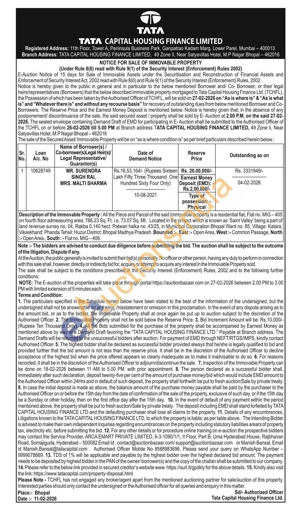 Description of the Immovable Property: All the Piece and Parcel of the said Immovable property is a residential flat, Flat no. MIG-405 on fourth floor admeasuring area: 786.23 Sq. Ft. l.e. 73.07 Sq. Mt. Located in the project which is known as 'Saint Valley' being a part of land revenue survey no. 04, Rakba 0.140 hect. Patwari halka no. 43/25, in Municipal Corporation Bhopal Ward no. 85. Village: Katara. Vikaskhand: Phanda Tehsil: Huzur District: Bhopal Madhya Pradesh. Bounded: East: Open Area, West: Common Passage, North -Open Area, South: Flatno. MIG-408.