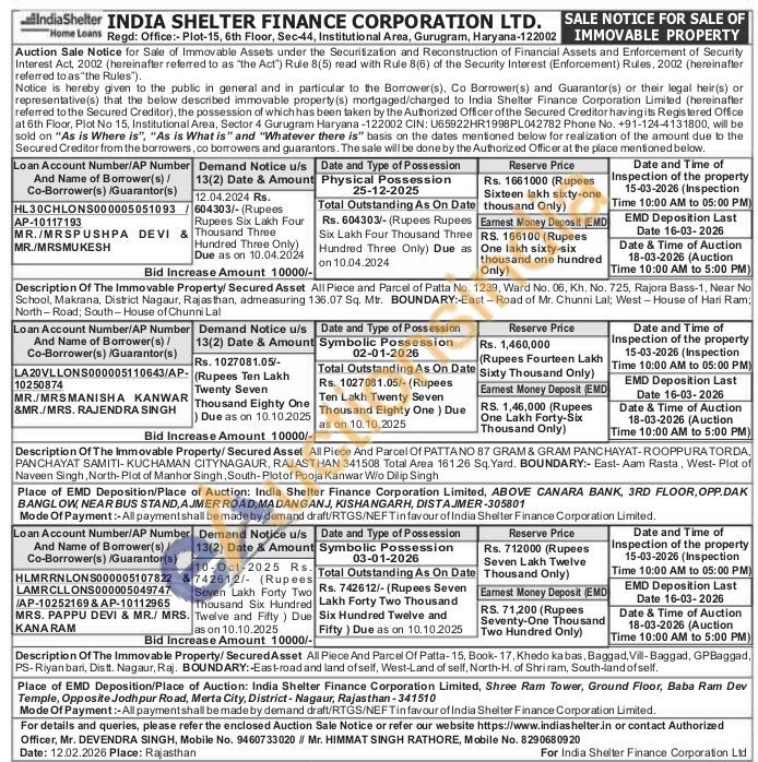 contact Authorized Officer, Mr. DEVENDRA SINGH, Mobile No. 9460733020 // Mr. HIMMAT SINGH RATHORE, Mobile No. 8290680920