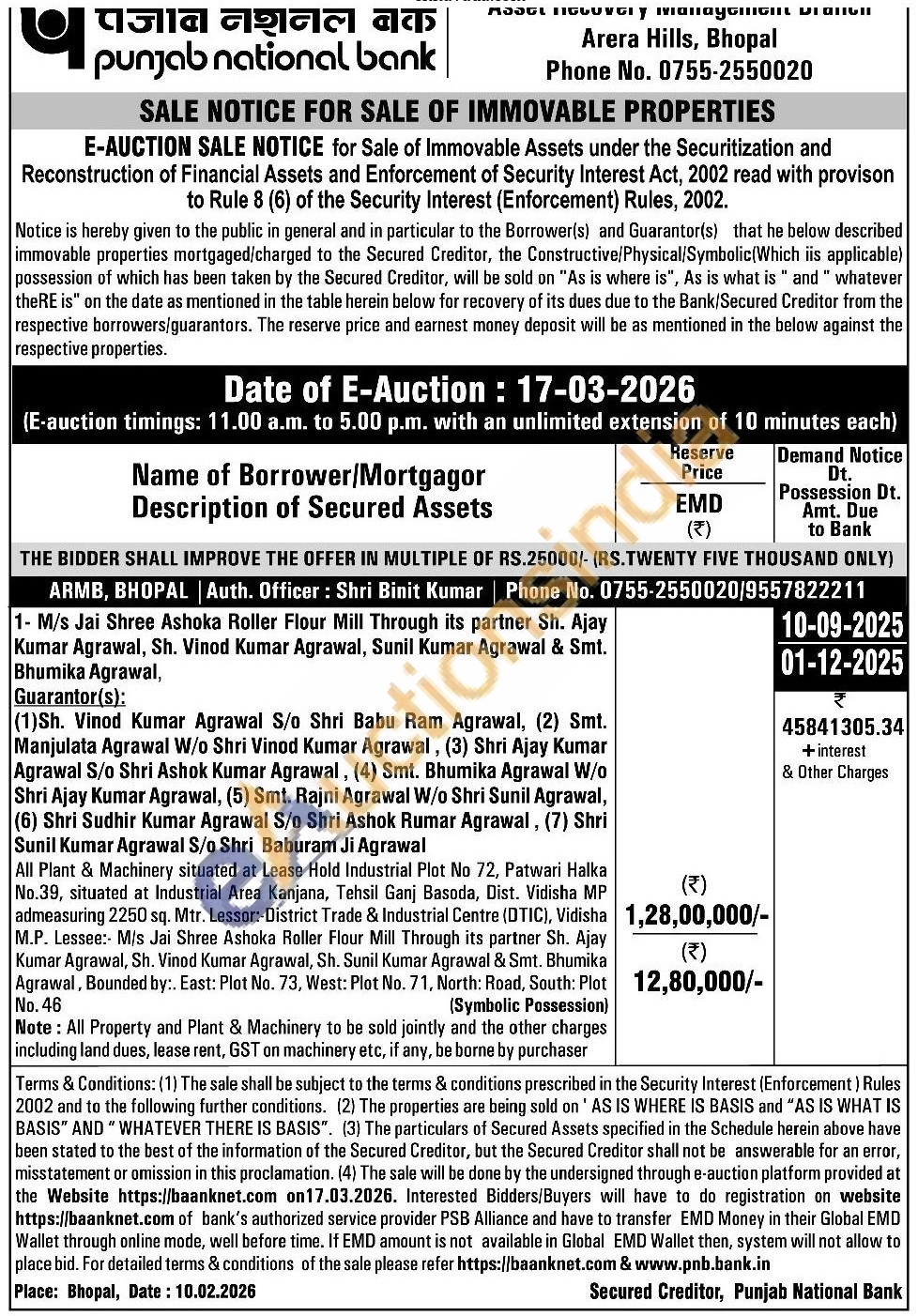 All Plant & Machinery situated at Lease Hold Industrial Plot No 72, Patwari Halka No.39, situated at Industrial Area Kanjana, Tehsil Ganj Basoda, Dist. Vidisha MP admeasuring 2250 sq. Mtr. Lessor: District Trade & Industrial Centre (DTIC), Vidisha M.P. Lessee: M/s Jai Shree Ashoka Roller Flour Mill Through its partner Sh. Ajay Kumar Agrawal, Sh. Vinod Kumar Agrawal, Sh. Sunil Kumar Agrawal & Smt. Bhumika Agrawal, Bounded by:. East: Plot No. 73, West: Plot No. 71, North: Road, South: Plot No. 46