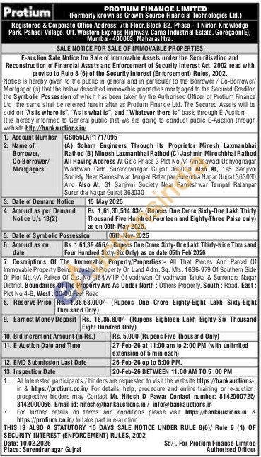 Descriptions Of The Immovable Property/Properties: All That Pieces And Parcel Of Immovable Property Being Industrial Property On Land Adm. Sq. Mts. 1636-979 Of Southern Side Of Plot No 4/A Paikee Of Cs. No. 484/A/1P Of Vadhwan Of Vadhwan Taluka & Surrendra Nagar District. Boundaries Of The Property Are As Under North: Others Property, South: Road, East: Plat No.4-B, West: 30-00 Feet Road