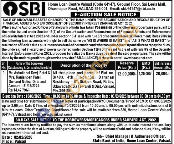All that piece and parcel of Flat no. B/403, 4th Floor, "Sai Darshan Residency-B", Station Road, Retlav, Udawada (R.S.) Ta-Pardi & Dist.-Valsad, Pin.396185