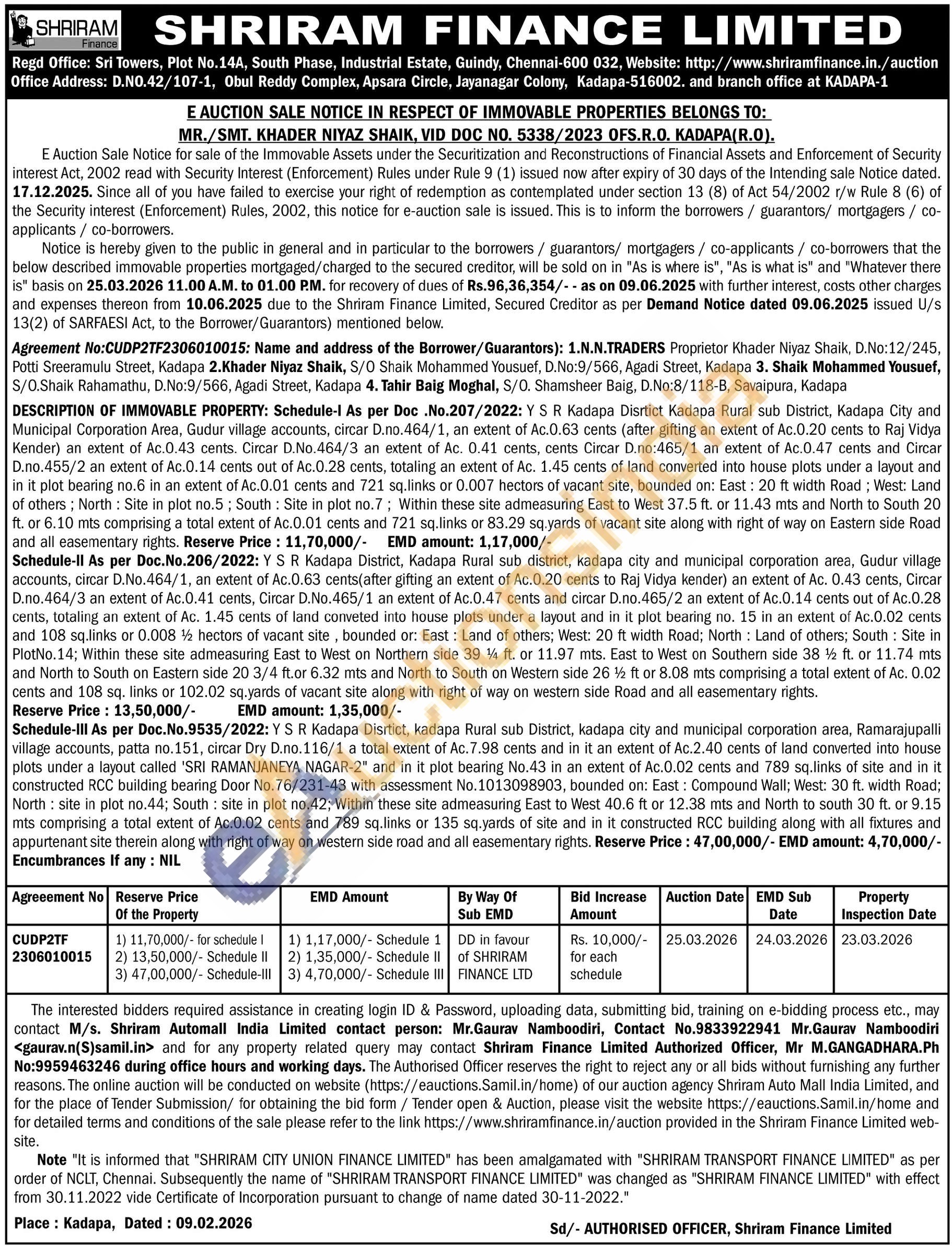 DESCRIPTION OF IMMOVABLE PROPERTY: Schedule-I As per Doc .No.207/2022: YSR Kadapa Disrtict Kadapa Rural sub District, Kadapa City and Municipal Corporation Area, Gudur village accounts, circar D.no.464/1, an extent of Ac.0.63 cents (after gifting an extent of Ac.0.20 cents to Raj Vidya Kender) an extent of Ac.0.43 cents. Circar D.No.464/3 an extent of Ac. 0.41 cents, cents Circar D.no:465/1 an extent of Ac.0.47 cents and Circar D.no.455/2 an extent of Ac.0.14 cents out of Ac.0.28 cents, totaling an extent of Ac. 1.45 cents of land converted into house plots under a layout and in it plot bearing no.6 in an extent of Ac.0.01 cents and 721 sq.links or 0.007 hectors of vacant site, bounded on: East: 20 ft width Road; West: Land of others; North: Site in plot no.5; South: Site in plot no.7; Within these site admeasuring East to West 37.5 ft. or 11.43 mts and North to South 20ft. or 6.10 mts comprising a total extent of Ac.0.01 cents and 721 sq.links or 83.29 sq.yards of vacant site along with right of way on Eastern side Road and all easementary rights
