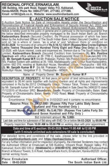 DESCRIPTION OF PROPERTY: All that piece an parcel of land admeasuing 10 70 Ares equivalent to 26.44 cents together with building thereon and all nights and improvements comprised in Re.Sy No. 207/2 Chittilappilly Village, Thrissur Taluk, Thrissur District, owned by Mr. Sampath kumar MP which is more fully described in Sale Deed No.3490/2015 dated 11/12/2015 of Mundoor SRO. Boundaries: South: Property of Chirukandathu Balan, East: Property of Chirukandathu Balan: North: PWD Road: West: Property of Chirukandathu Purushothaman